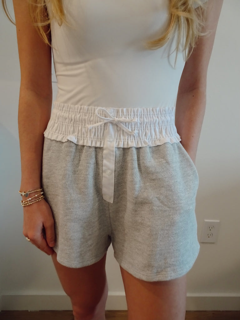 Alyssa Shorts - These gray and white scrunch waist shorts are absolutely adorable. Its button detailing and tie bow make these shorts a must have! Add these to your closet today!
