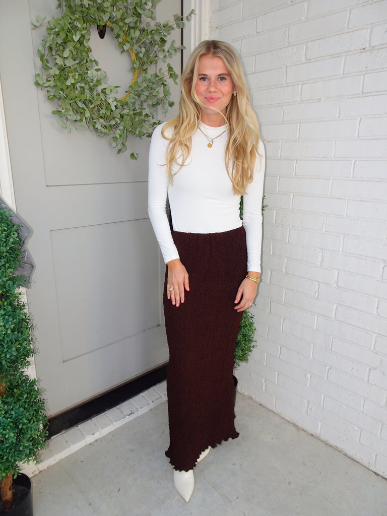 Hazel Textured Maxi Skirt - This brown maxi skirt is so pretty! It has unique texturing on the whole skirt that make this skirt absolutely adorable! There are so many ways to style this skirt and would be perfect for the Fall and Winter seasons! Don't miss out on this adorable skirt!