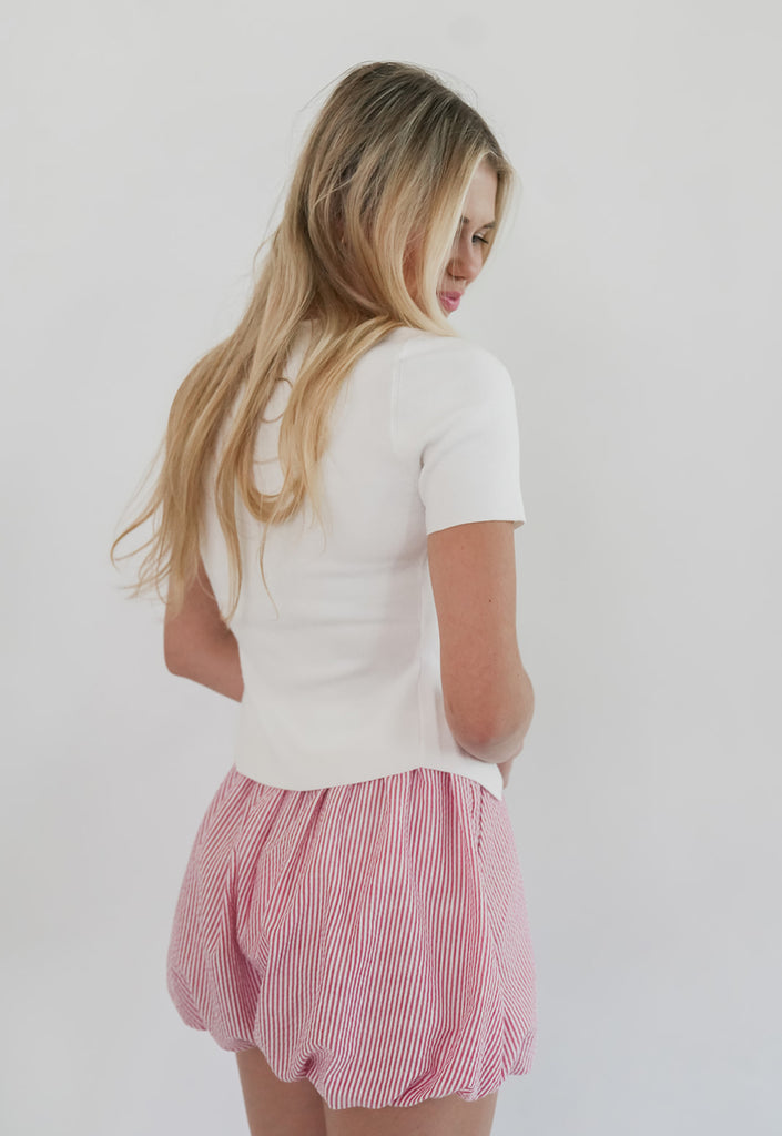 Kelsey Bubble Shorts - These shorts are so cute and comfortable! Its red pin stripes and midline buttoning make these shorts unique! These shorts are lined. Wear them with sneakers, sandals, or any shoe of choice! Get your Kelsey bubble shorts today!