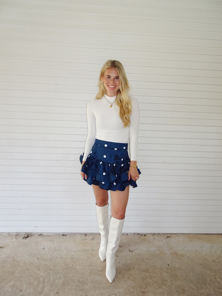 Macie Polka Dot Skirt - This polka dot skirt is so flattering and adorable! It has the cutest flare shape with ruffling at the bottom and a satin finish! This skirt would be gorgeous paired with boots, sneakers, or heels to dress it up or down! It also has a side zipper.