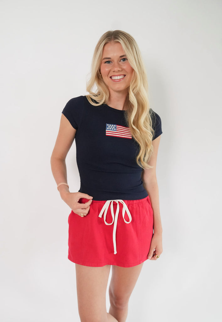 Rylie Skort - This red skort is so trendy and cute! Its cream drawstring and back pockets make this skort unique! This is perfect for any occasion! Get your Rylie skort today before its too late!
