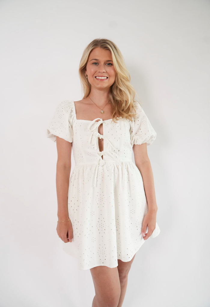 Ashlyn Mini Dress - This dress is so cute and flattering! Its eyelet detailing and midline tie bows make this dress so unique! Its puffer sleeves are different from all others! This dress is double lined! Get your Ashlyn mini dress today!