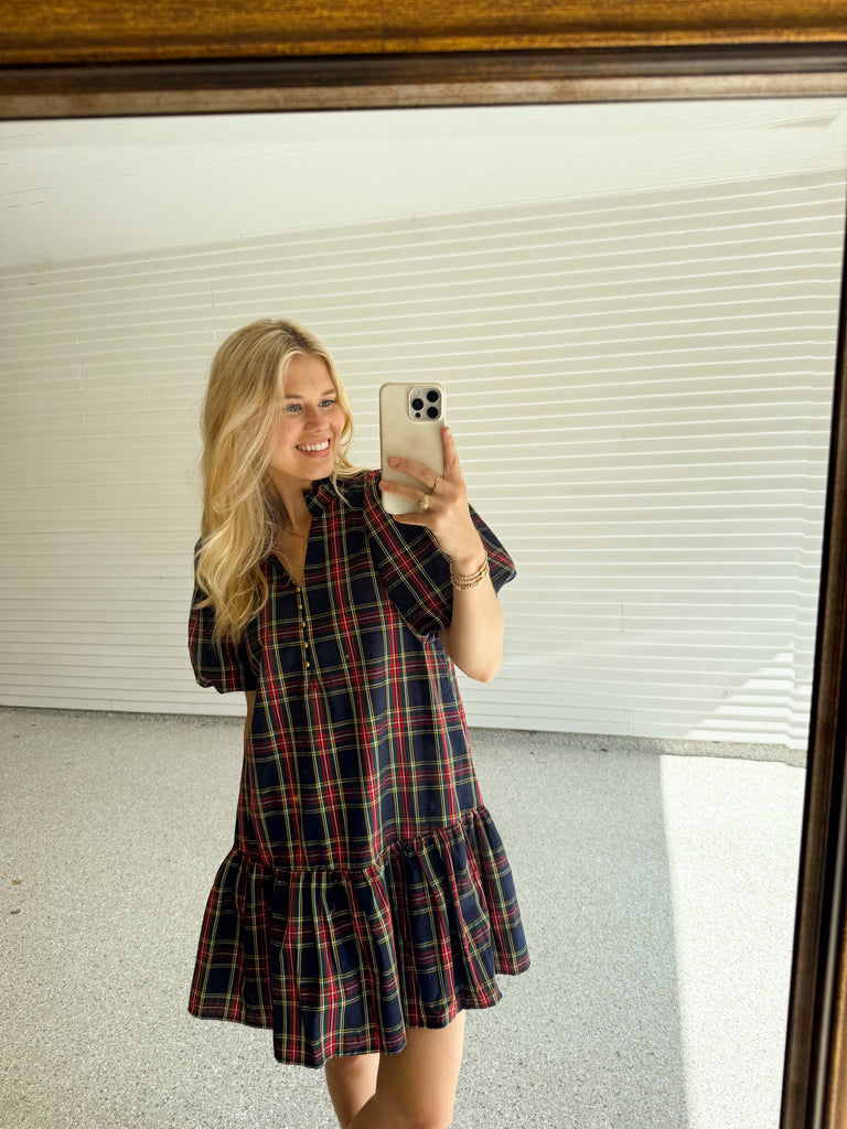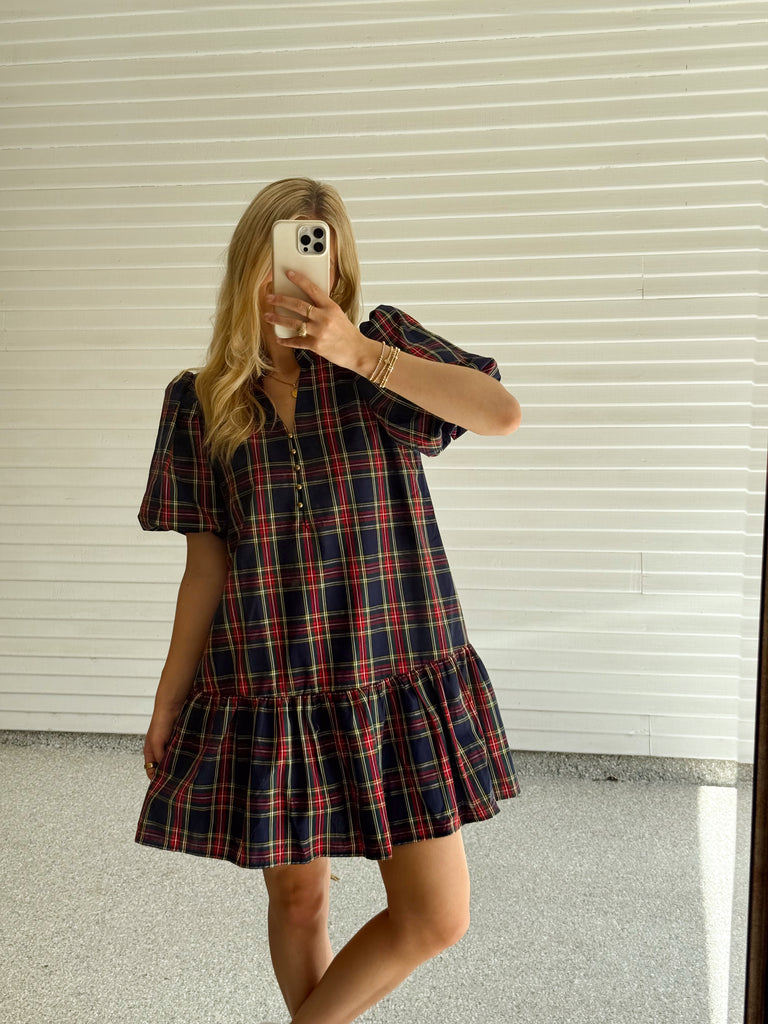 Belle Mini Dress - a timeless plaid favorite in rich shades of navy, red, green, and yellow. Designed with bubble sleeves, a drop-waist ruffle hem, and delicate gold-toned buttons, it's a feminine twist on a classic look. Fully lined for comfort and perfect for the holidays or any season!