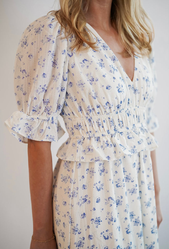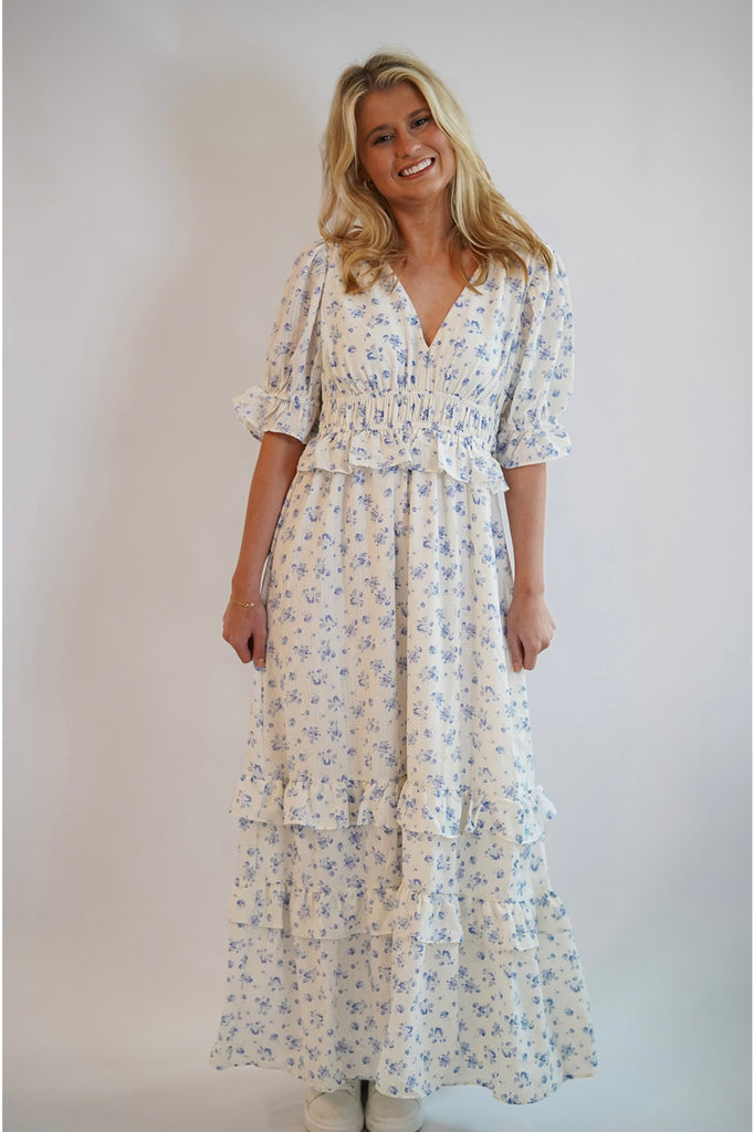 Catherine Maxi Dress - The Catherine Maxi Dress is so stunning! Its blue flower detailing and ruffling makes this dress stand out. This dress is double lined. Wear this dress with heels, sandals, or sneakers. It is perfect for any occasion! Get your Catherine maxi dress today!