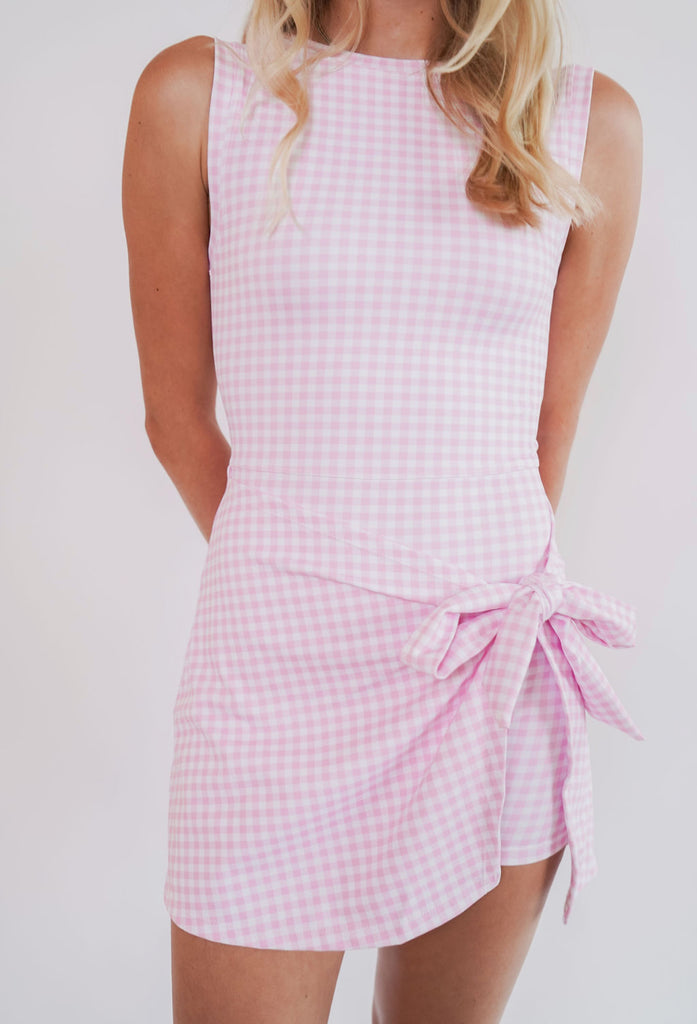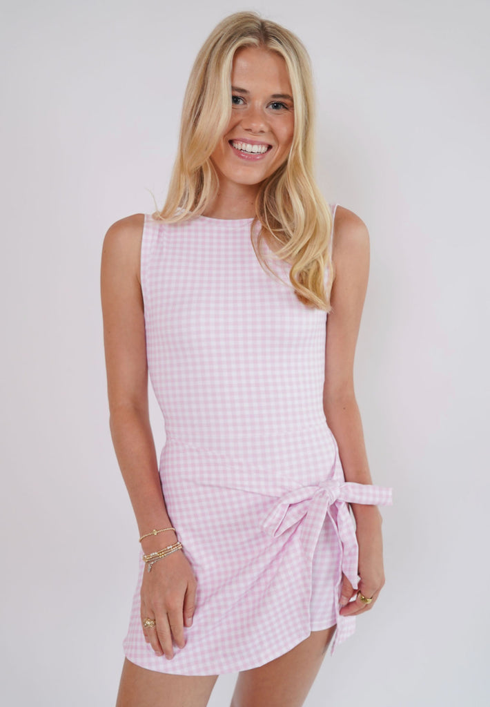 Collin’s Mini Dress - A favorite with all the right details! This pink gingham activewear mini is made from soft, stretchy fabric and features a tie-front design. With built-in shorts for comfort and ease, it’s perfectly paired with sneakers for a cute and sporty look.