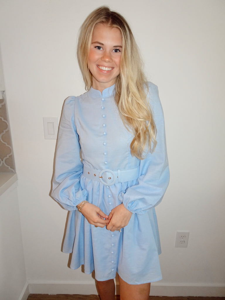 Eliana Button Dress - This dress is absolutely stunning! Its midline buttoning down the entirety of the dress makes it super unique. This dress is double lined and comes with a cute blue belt. Its scrunched waist and shoulders make this dress a must have. Add the Eliana dress to your closet today!