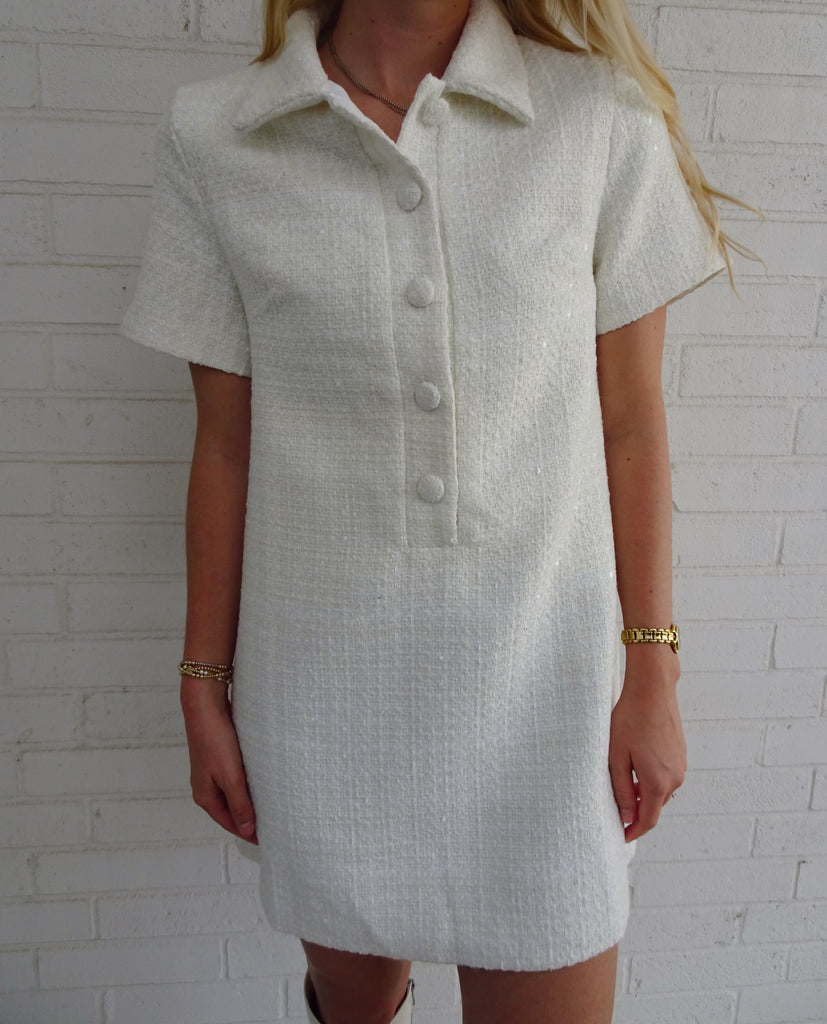 Emily Tweed Dress - This cream tweed dress is so adorable! It has the cutest button detailing and collar! It would be so cute paired with many different shoes such as, boots, sneakers, or heels! This dress is completely double lined.