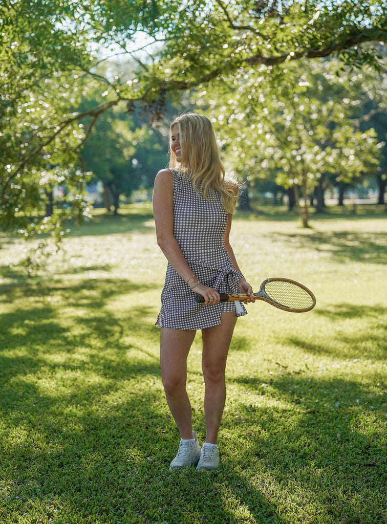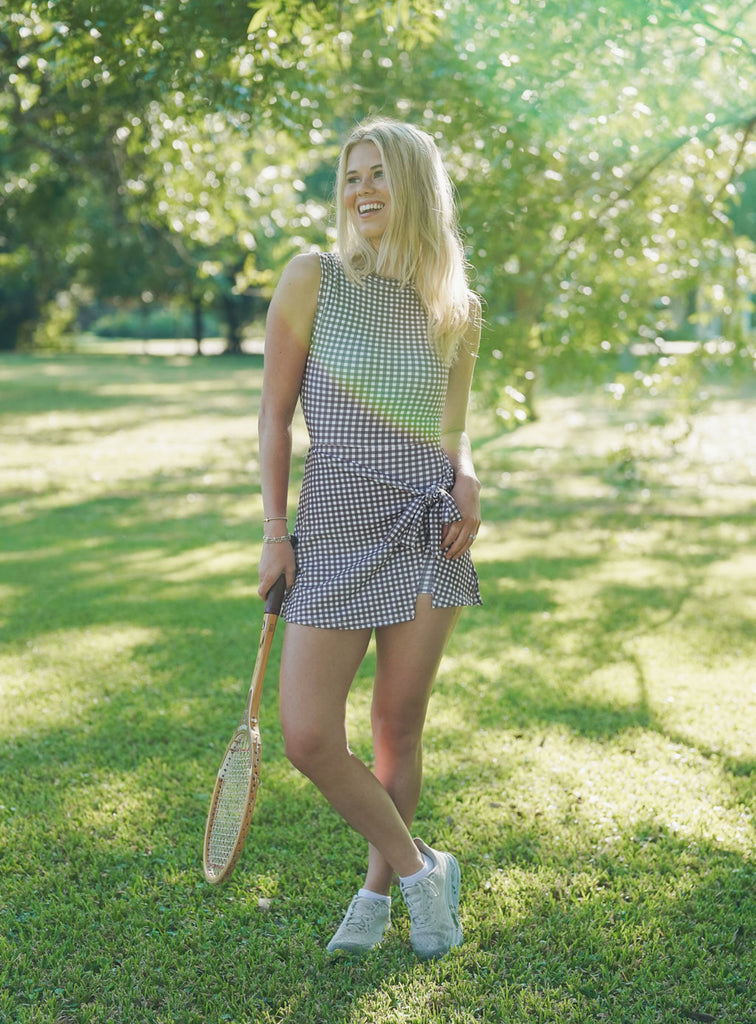 Ginger Gingham Mini Dress - A favorite with all the right details! This beautiful chocolate gingham activewear mini dress is made from soft, stretchy fabric and features a tie-front design. With built-in shorts for comfort and ease, it’s perfectly paired with sneakers for a cute and sporty look!