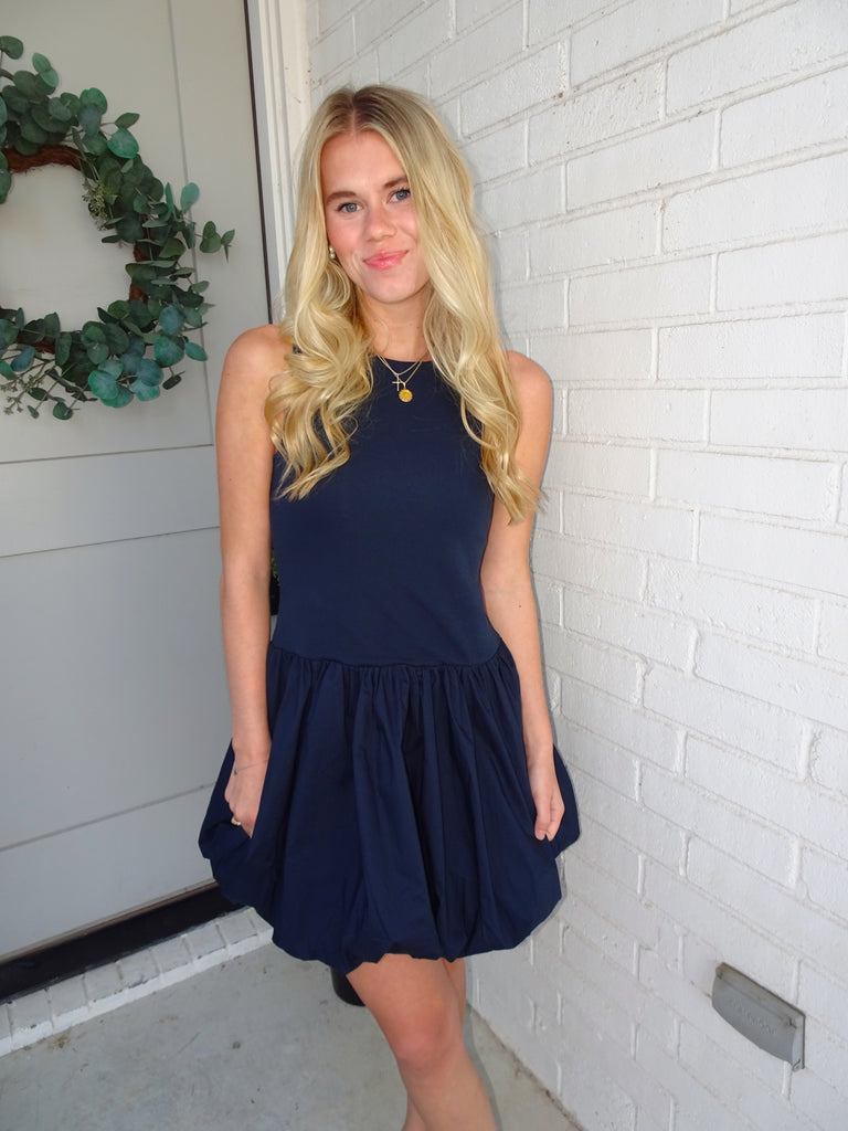 Hallie Drop Waist Bubble Dress - We love this navy dress! It is adorable with the bubble flare and drop waist detailing! This dress is perfect to be dressed up or down for many occasions! Shop the Hallie Dress today!