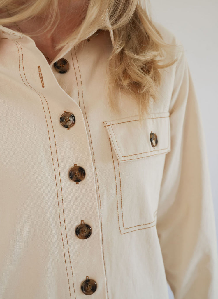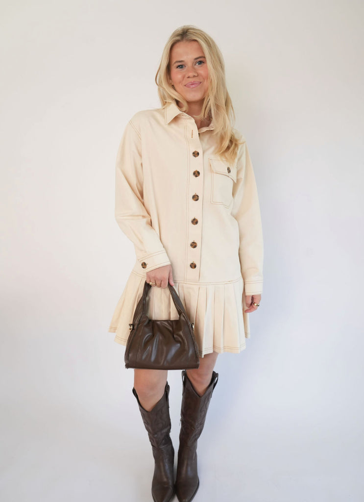 Janie Cream Dress - This dress is so cute and perfect for the upcoming season! Its cream denim material, chocolate colored stitching, midline buttons, and pleated bottom sets this dress apart from all others! Wear this dress with boots, sneakers, or any shoe of choice! Get your Janie cream dress today!