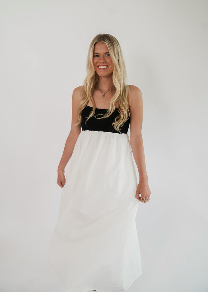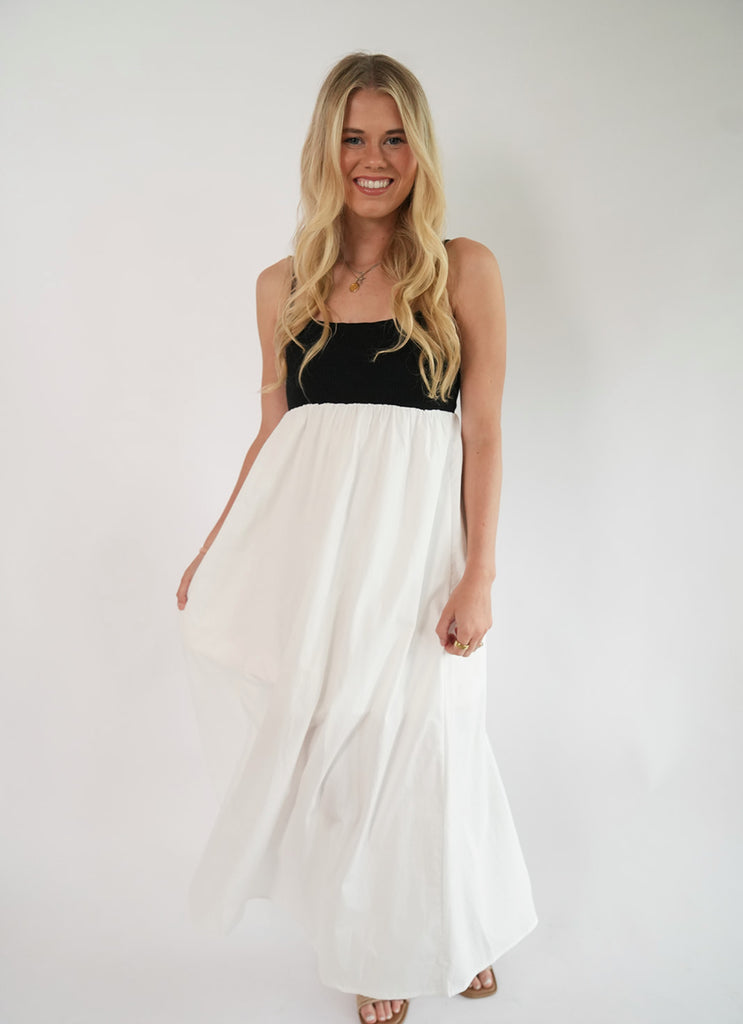 Jocelyn Maxi Dress - With a ribbed black top, cream skirt, and cinched detailing, the Jocelyn Maxi Dress is timeless, versatile, and perfect for any occasion. Lined half way down for comfort and ease. Ideal with sneakers, heels, flats, or any shoe you love!