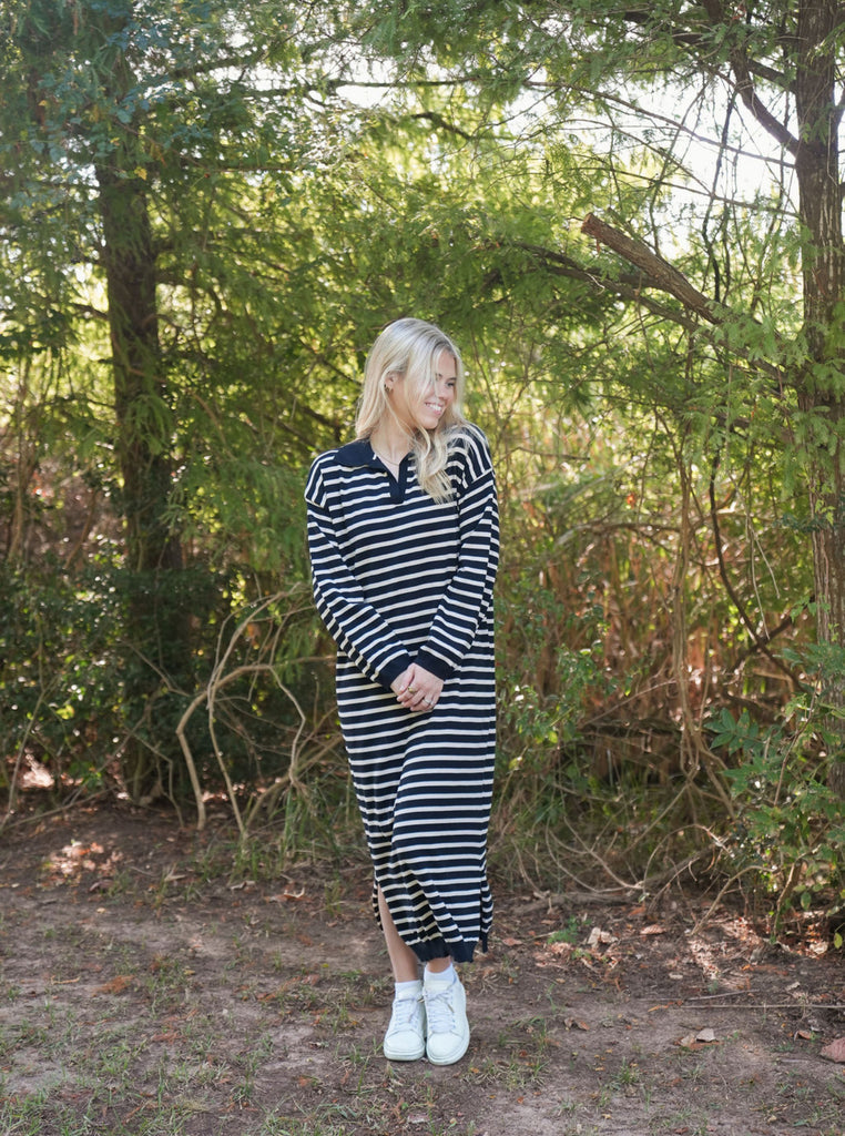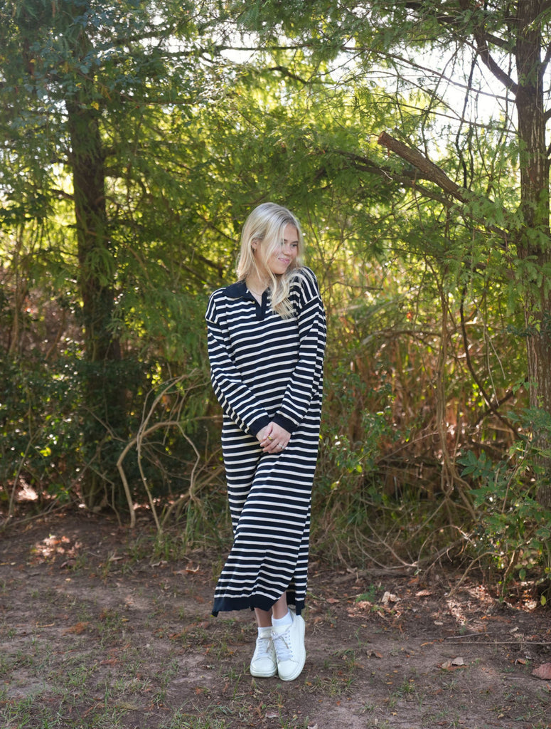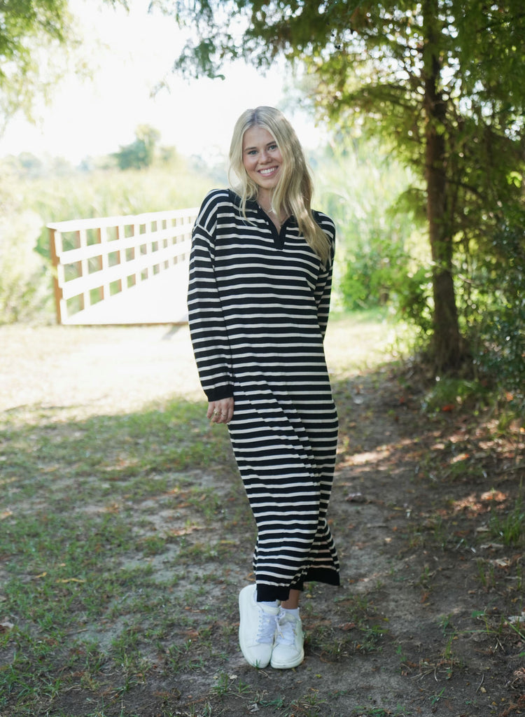 Kori Striped Maxi Dress - Effortless style meets all-day comfort in the Kori Striped Maxi Dress. Crafted in a cozy soft black fabric with subtle beige stripes, this collared maxi is designed to take you anywhere with ease. It’s relaxed yet flattering fit makes it perfect for the office, a casual lunch with friends, or dressed up for an evening out. This versatile dress pairs beautifully with sneakers, boots, or your favorite heels. From office hours to after hours, the Kori Striped Maxi Dress has you covered in comfort and style!