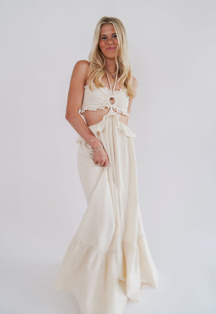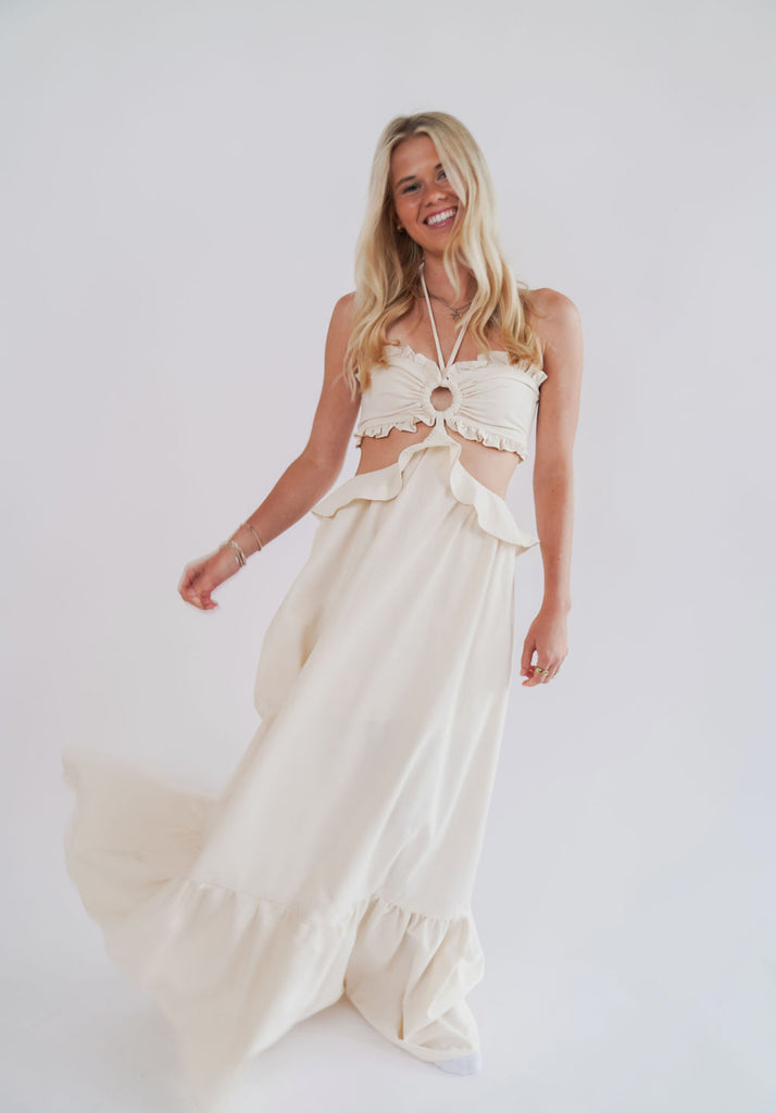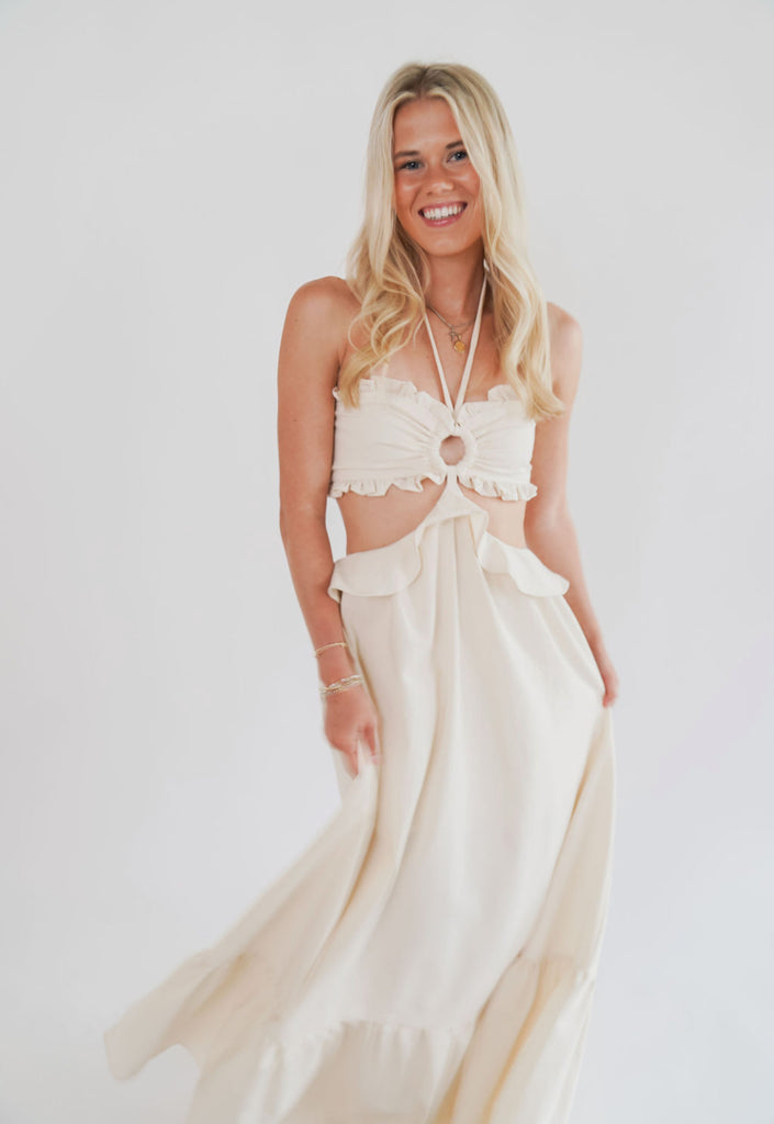 Kyra Maxi Dress - This beige maxi dress features a smocked back, soft ruffles, and stylish side cutouts that make it truly unique! Lined half way down for comfort and ease, it pairs beautifully with heels, sandals or any shoe you love.