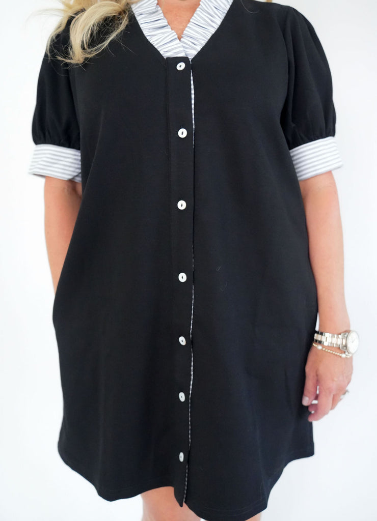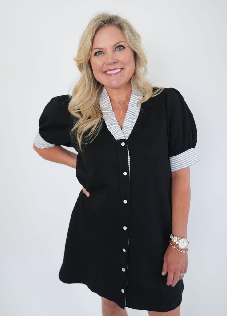 Melissa Mini Dress - This timeless and flattering mini features striped border detailing, a button-front design, and pockets! This dress is made for any occasion and is easily dressed up or down!