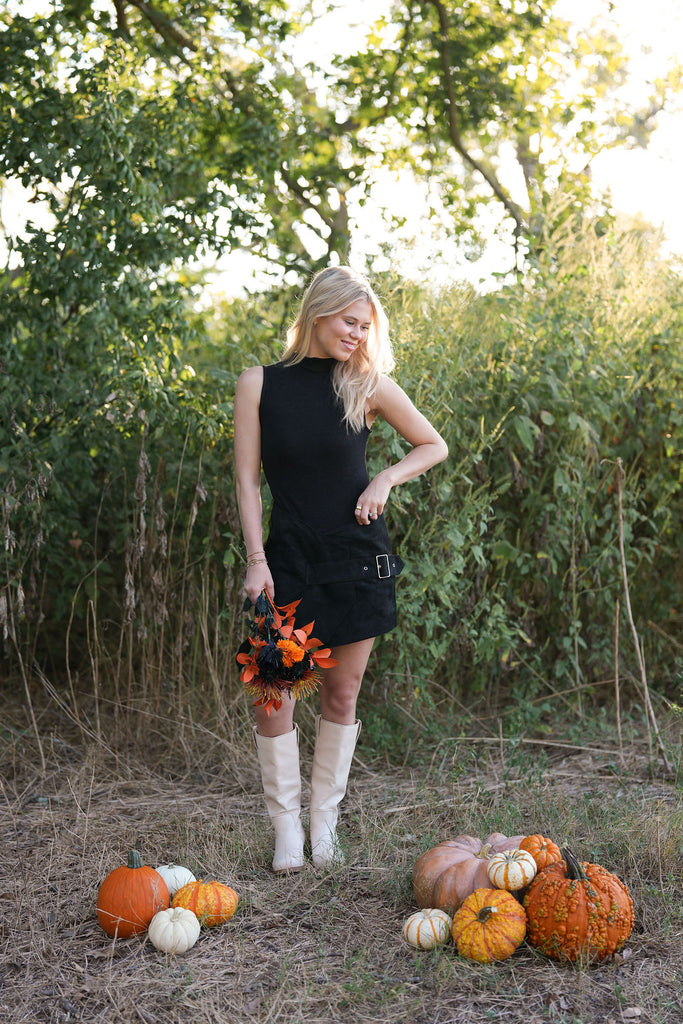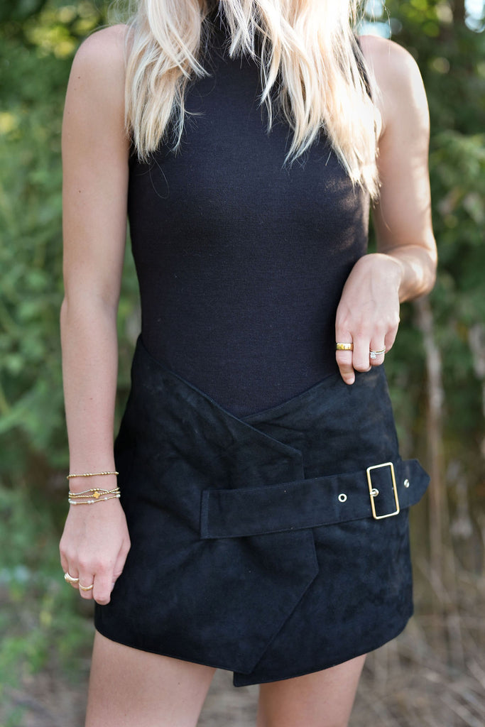 Michaela Mini Dress - Turn heads this fall and winter with the Michaela Mini Dress! It’s black knit top and black suede bottom create a standout look, while the side buckle and built in shorts ensure comfort and flair for any occasion!