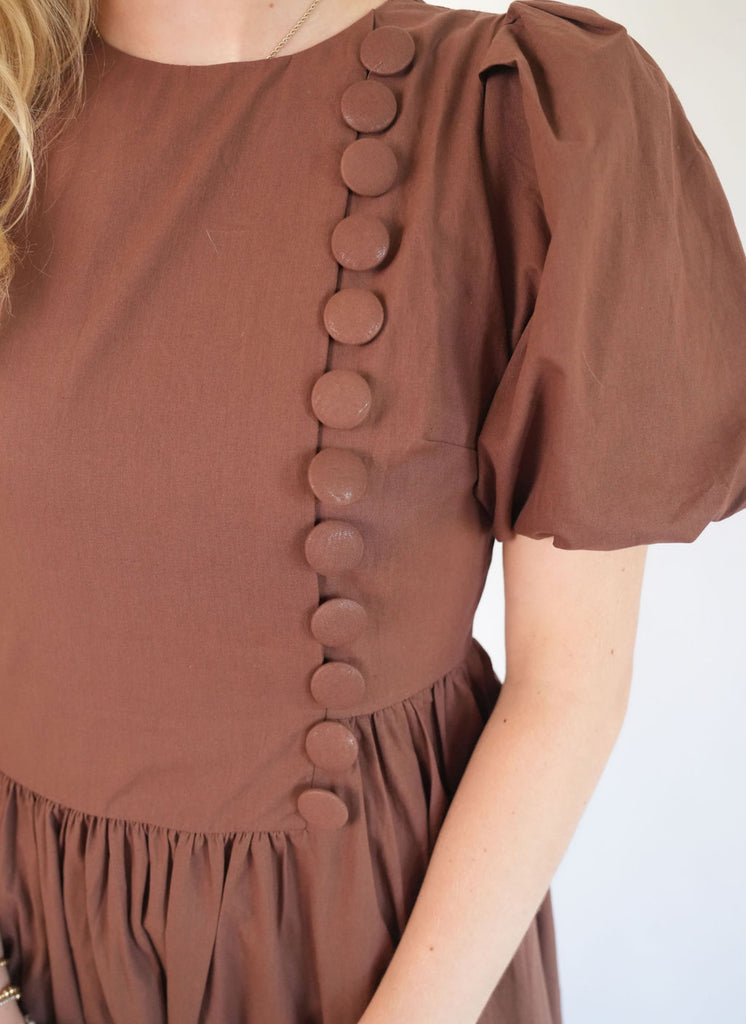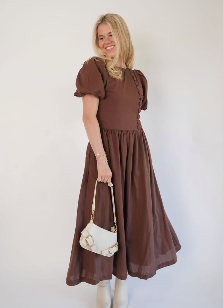 Elizabeth Maxi Dress - Make a statement in the Elizabeth Maxi Dress. Crafted in a rich chocolate brown, this dress features beautiful, unique button detailing and stylish puff sleeves, setting it apart from ordinary maxis. Effortlessly versatile, it pairs beautifully with wedges, platforms, boots, flats, or any shoe of your choice. Stunning and perfect for the season, the Elizabeth Maxi Dress is sure to become a favorite in your wardrobe!