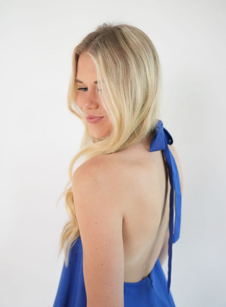 Nicole Bubble Dress - Flattering and fun, the Nicole Bubble Dress in royal blue features a halter neckline and a low back for a standout look! Fully lined for comfort, it’s perfect with sneakers, sandals, or any shoe you choose.