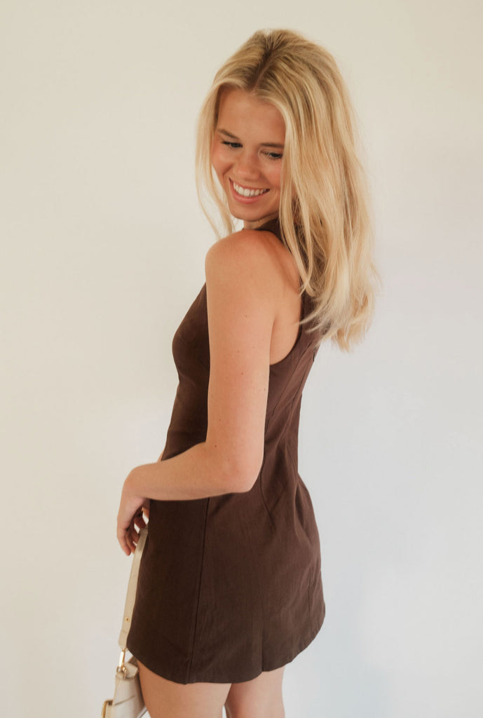 Remington Mini Dress - This chocolate mini dress is so cute and simple! Wear this dress with sneakers, flats, or boots! This dress is lined with shorts underneath. Get your Remington mini dress today!