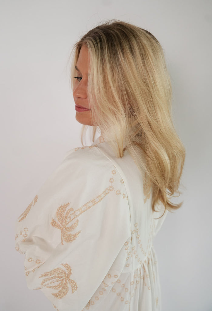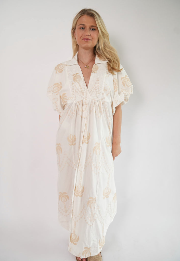 Sarah Palm Maxi Dress - This dress is so cute and perfect for your upcoming summer vacation! Its palm stitch detailing and midline buttons make this dress a must have! This dress has a smocked V-neck and bubble sleeving. Whether you're attending a fancy beach dinner or wearing this dress as a swim cover up, it is perfect for you! Get your Sarah palm dress today!