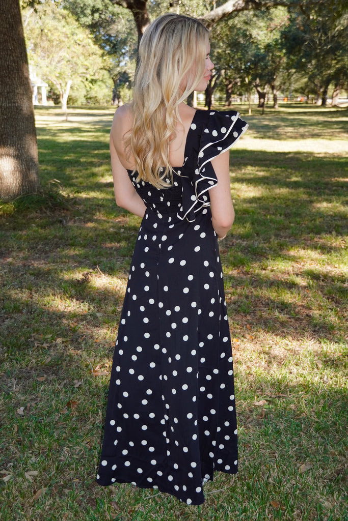 Savannah Polka Dot Dress - This one shoulder maxi dress is stunning! It has the cutest one shoulder ruffle detailing and small triangle cut out. This dress would be perfect for so many occasions and is one of our personal favorites! The dress has a zipper in the back and built in bra pads. It is also completely double lined.