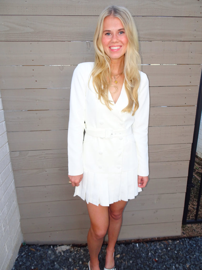 Sutton Button Dress - This white dress is absolutely stunning! It has the cutest button detailing, belt, and pleats, making this the cutest dress for any event! We think this dress could be dressed up with heels or down with sneakers! This dress is a v-neck and double lined down to the pleats.