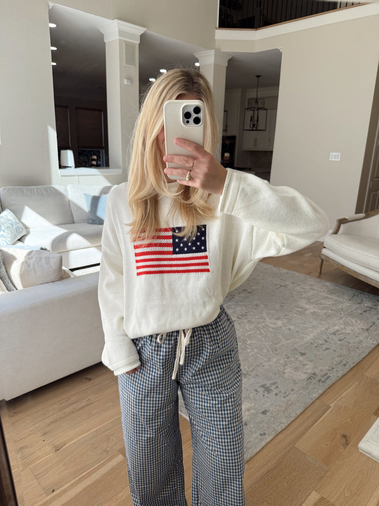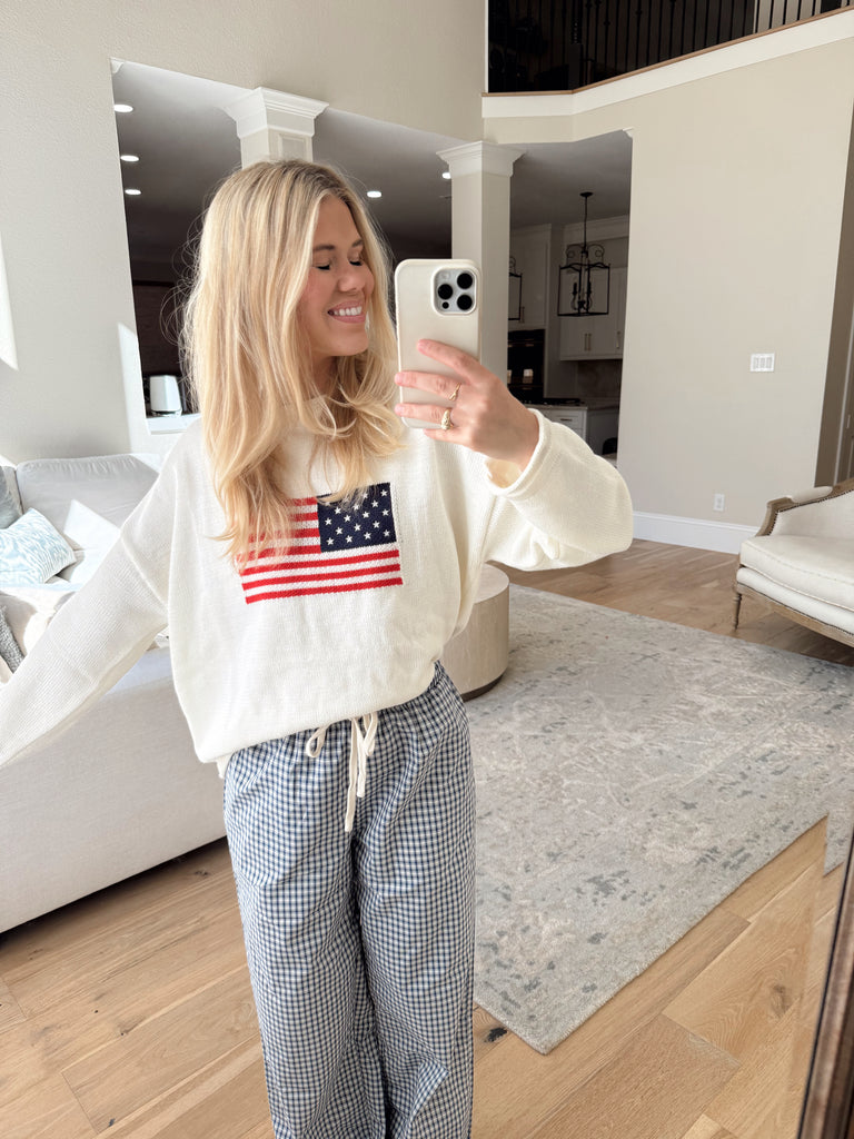 Bella Gingham Pants - Sweet, stylish, and effortlessly comfy-our Bella Gingham Pants are the perfect blend of charm and comfort. Designed in a navy and cream gingham print with a drawstring waist, they’re ideal from everything to lunch dates to cozy afternoons at home. Pair them with the Joyful Is She American Flag Sweater for a timeless look that’s both relaxed and refined.