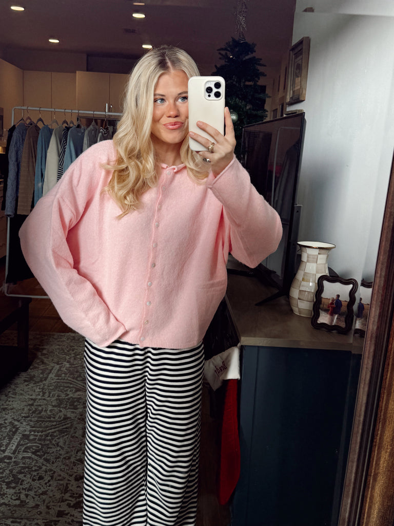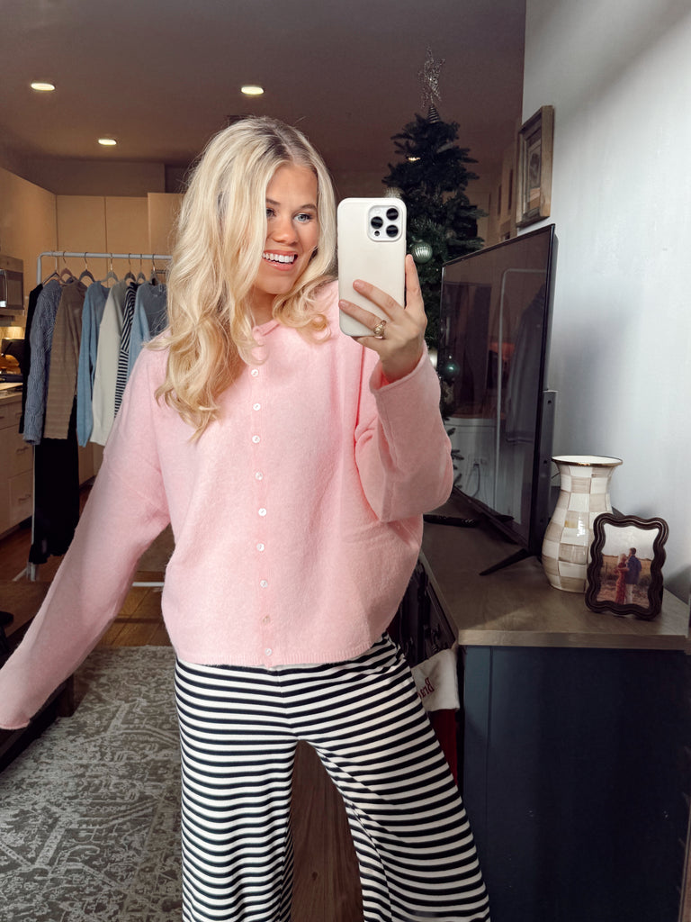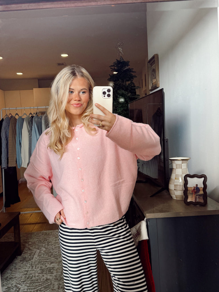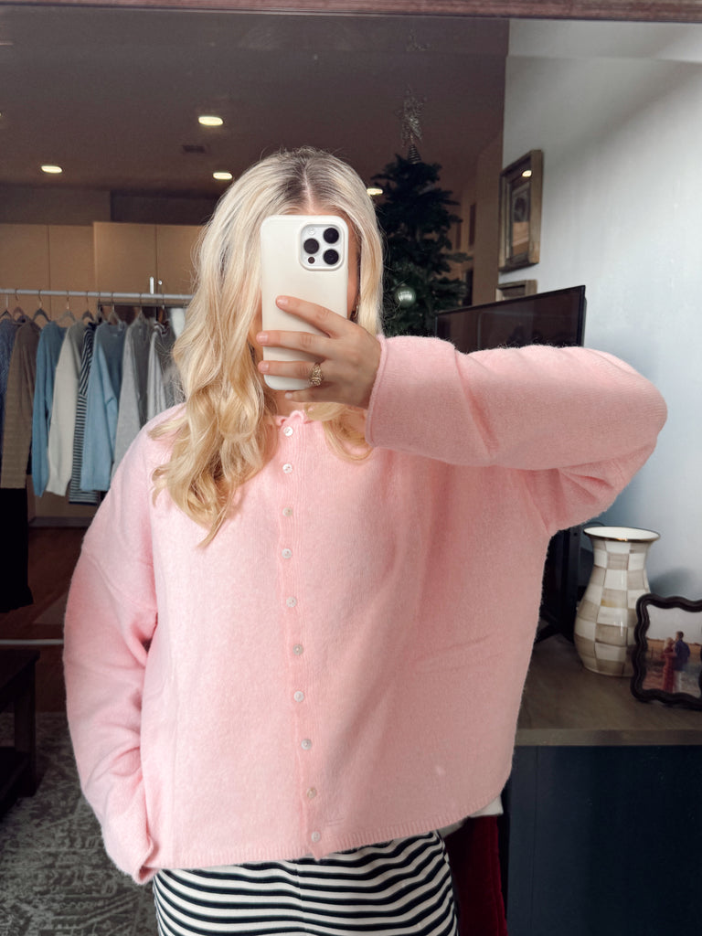 Claire Pink Cardigan - Meet the Claire Pink Cardigan—an irresistibly soft and adorable closet essential. This versatile piece features a classic midline button closure and a flattering, timeless fit. Perfect with denim and effortless to style, it can be dressed up or down, layered or worn on its own. Cozy, chic, and endlessly wearable, the Claire Pink Cardigan is the everyday basic you'll reach for again and again.