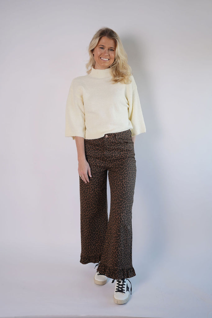 Gracie Cheetah Pants - Feminine, fun, and effortlessly stylish, the Gracie Cheetah Pants feature a brown-and-black cheetah print on soft denim. Designed with a button-and-zipper closure and ruffled bottom hems, they add a subtle, girly touch to any outfit. Pair them with the cream or black Joyful Is She Anne Top, the Harley Cream Top, the red Hattie Cardigan or your favorite top for versatile styling. Perfect for bestie lunches, a day at work, or an evening out, these pants are a standout piece that blends girly charm with effortless sophistication.