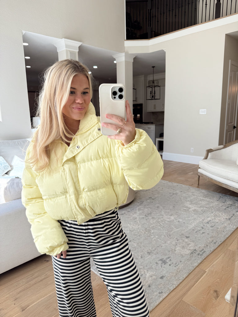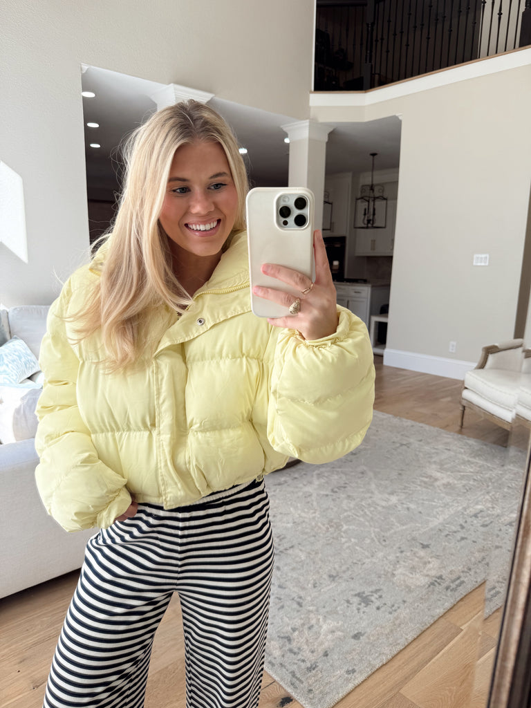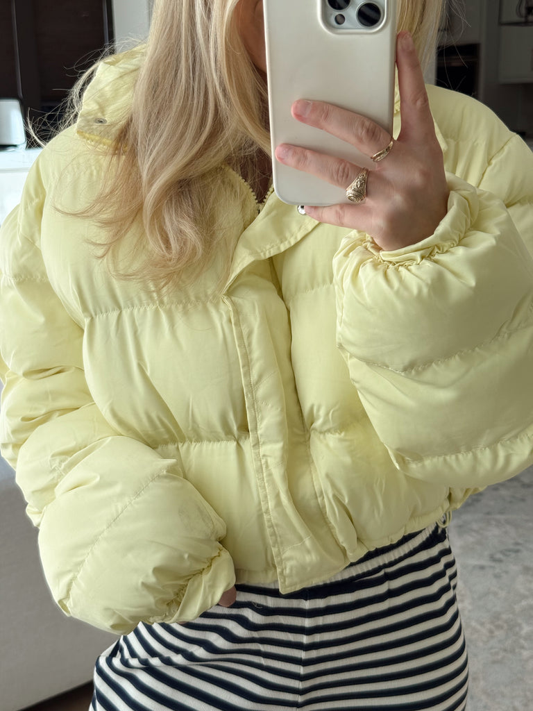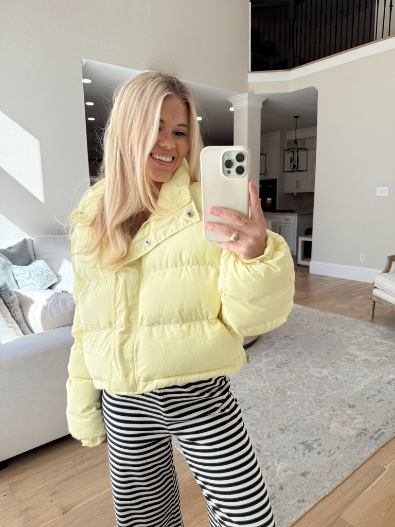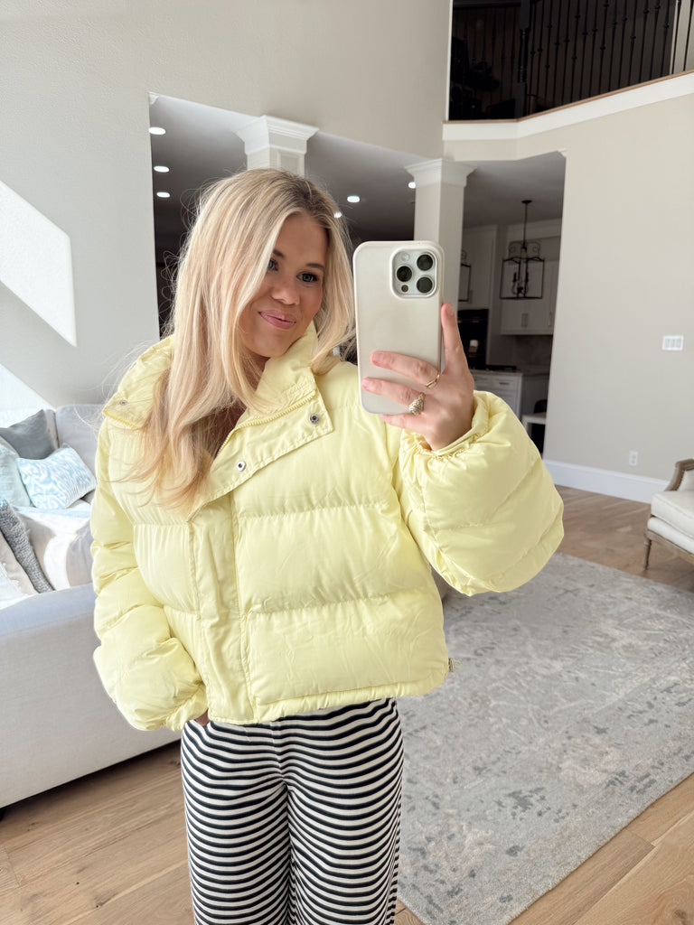 Isabella Yellow Puffer - Brighten up your look with this adorable light yellow puffer! Designed with a front zipper and snap closures for extra warmth, plus pockets and an adjustable drawstring hem you can cinch or leave relaxed for the perfect fit. A cozy, cheerful must-have for the season.