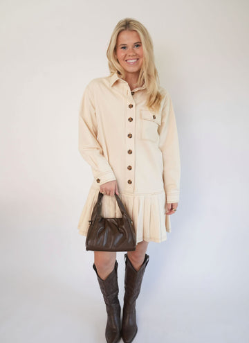 Janie Cream Dress - This dress is so cute and perfect for the upcoming season! Its cream denim material, chocolate colored stitching, midline buttons, and pleated bottom sets this dress apart from all others! Wear this dress with boots, sneakers, or any shoe of choice! Get your Janie cream dress today!