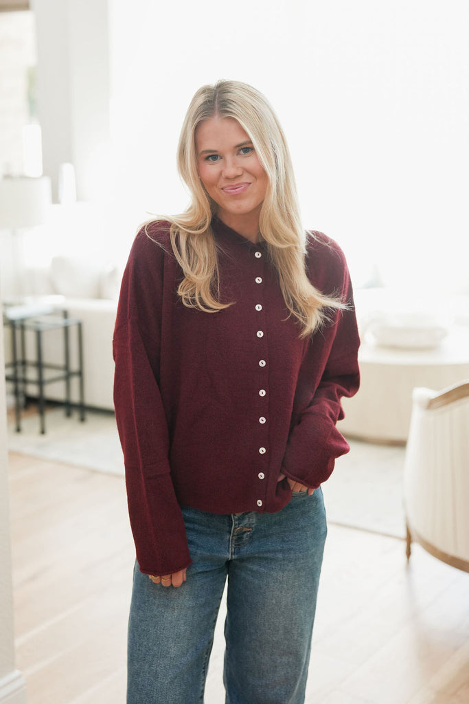 Laycie Burgundy Cardigan - Cozy, classic, and perfect for the season — the Laycie Burgundy Cardigan is a timeless wardrobe staple. Crafted from a soft knit, this piece features midline buttons and a flattering fit that makes it easy to layer or wear on its own. Pair it with your favorite denim or any go-to bottom for an effortlessly chic look that never goes out of style.