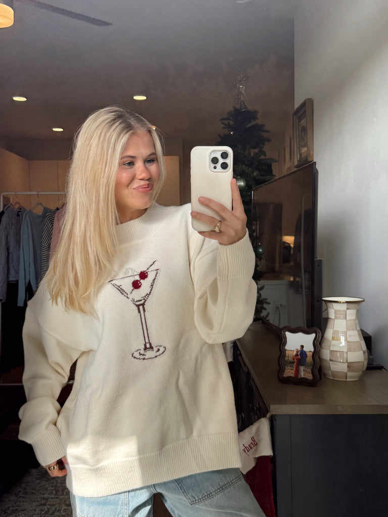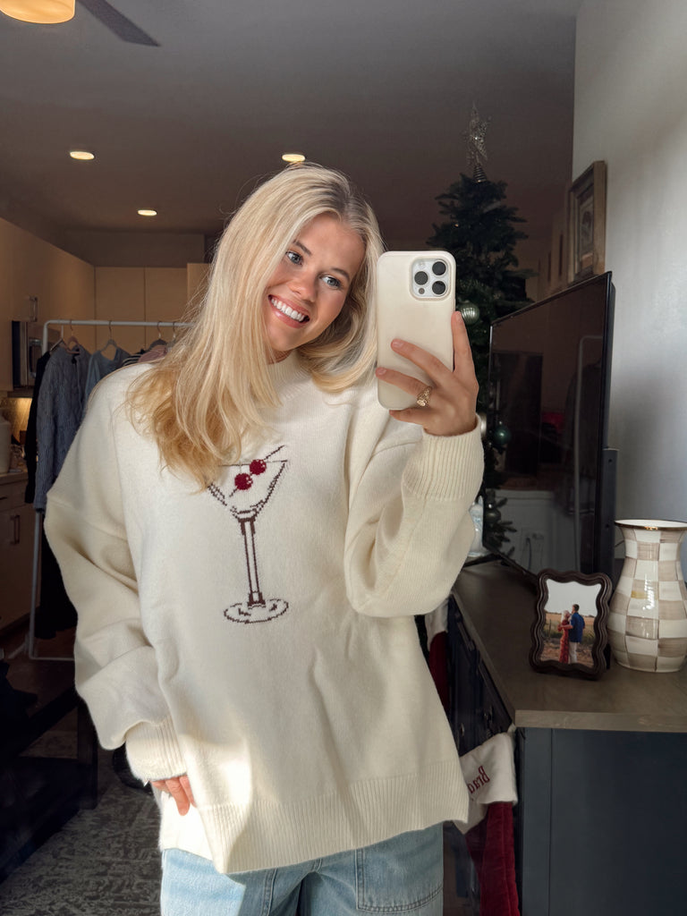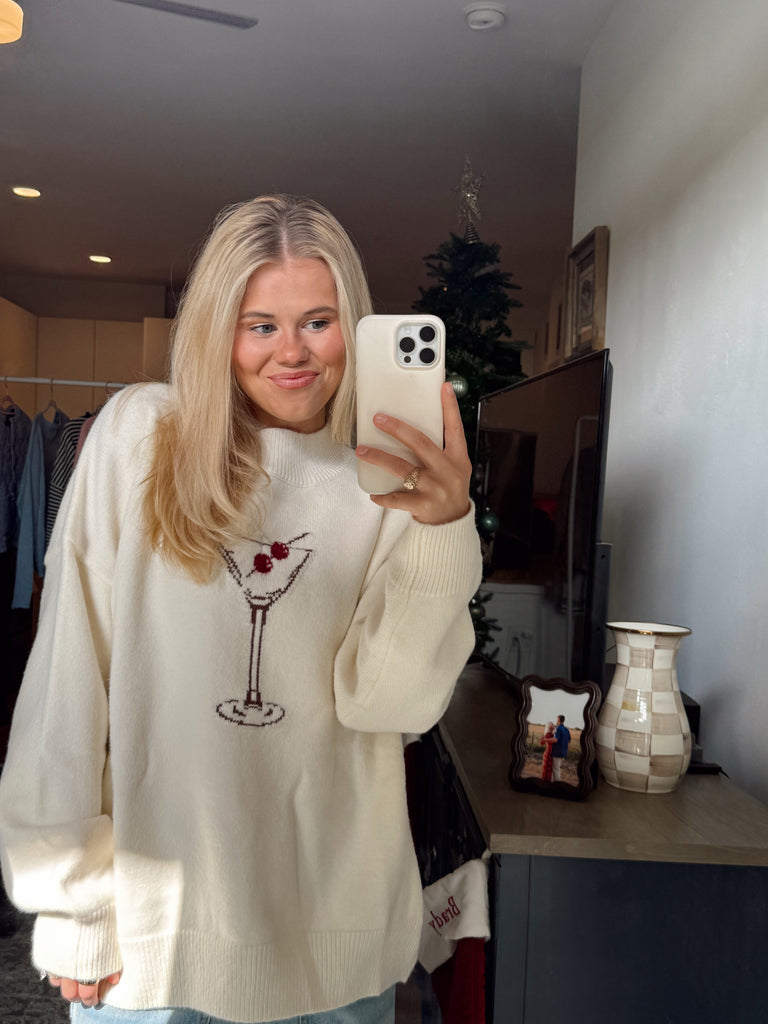 Martini Sweater - Celebrate the season in style with the graphic cream Martini Sweater. Featuring a fun cherry martini graphic, ribbed border detailing, and soft material, this sweater is as cozy as it is cute. Pair it with jeans, skirts, or any favorite bottoms for an effortlessly fun and trendy look.