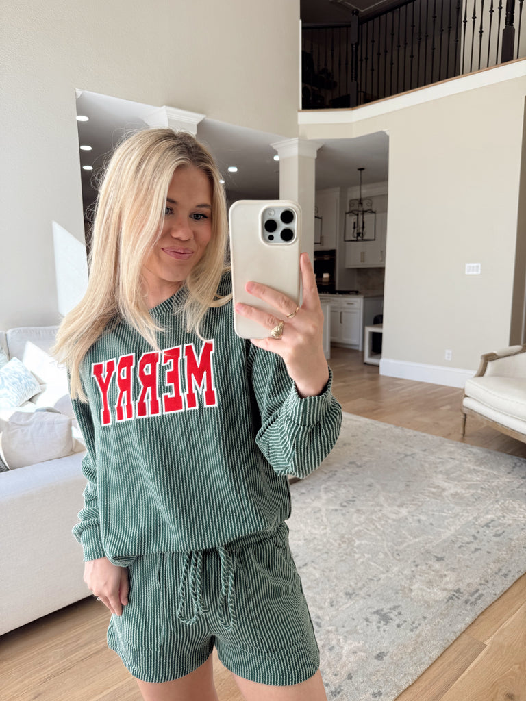 Merry Comfy Set - Get in the holiday spirit with the Merry Comfy Set — a new festive fave. This hunter green lounge set features a flowy ribbed top with "merry" embroidered across the front, perfectly paired with matching lounge shorts. The shorts include a drawstring waistband and pockets for that ideal mix of cozy and cute. Perfect for relaxing at home or celebrating the season in comfort and style.