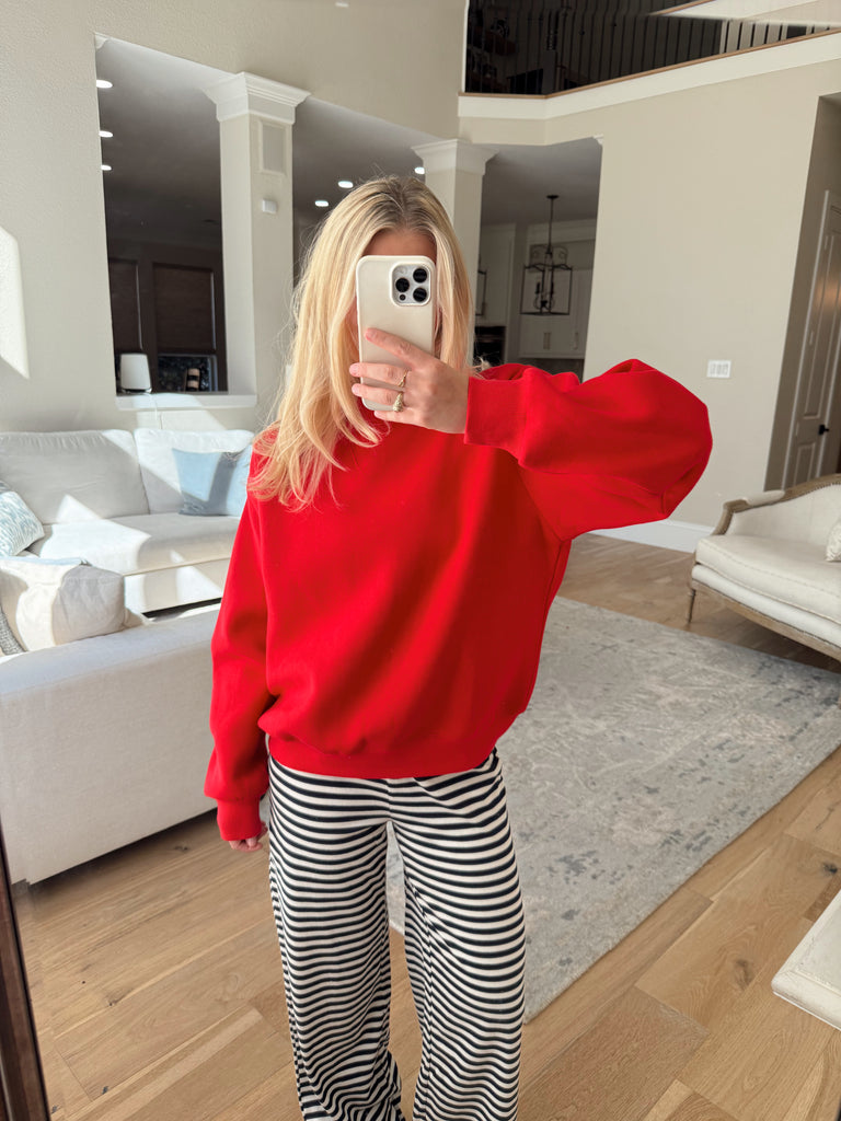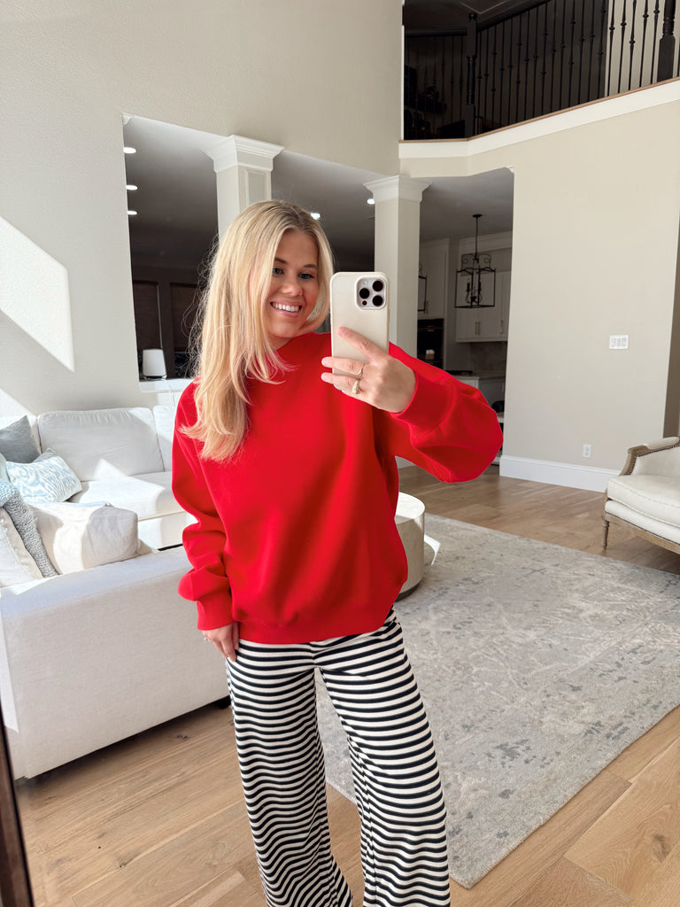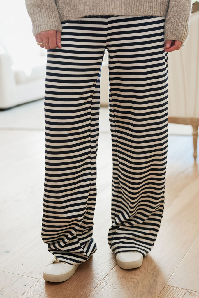 Mickey Striped Pants - Effortlessly chic and endlessly cozy - our Mickey Stripe Pants are a must-have for any season. Designed in a timeless navy and cream stripe, these pants feature a soft, lightweight fabric. The elastic waistband ensures all-day comfort, whether you're heading out for brunch with friends or curling up for a cozy night in. Pair them with the Joyful Is She Kinley Mock Neck in Red or Duck Sweater for a classic, elevated look that's both relaxed and refined.