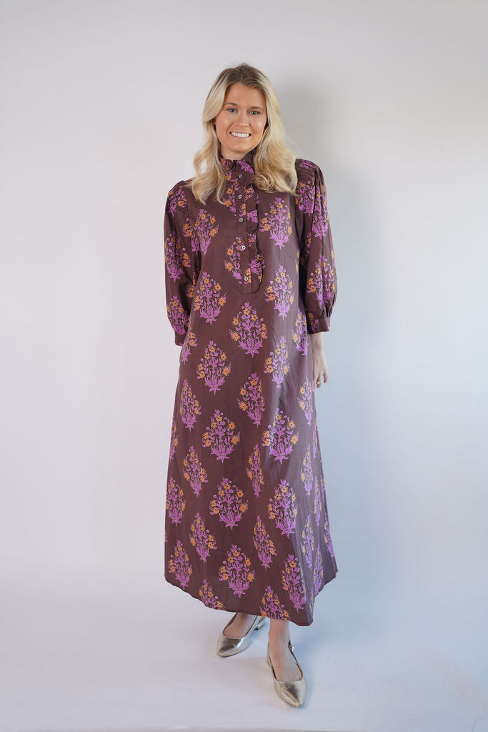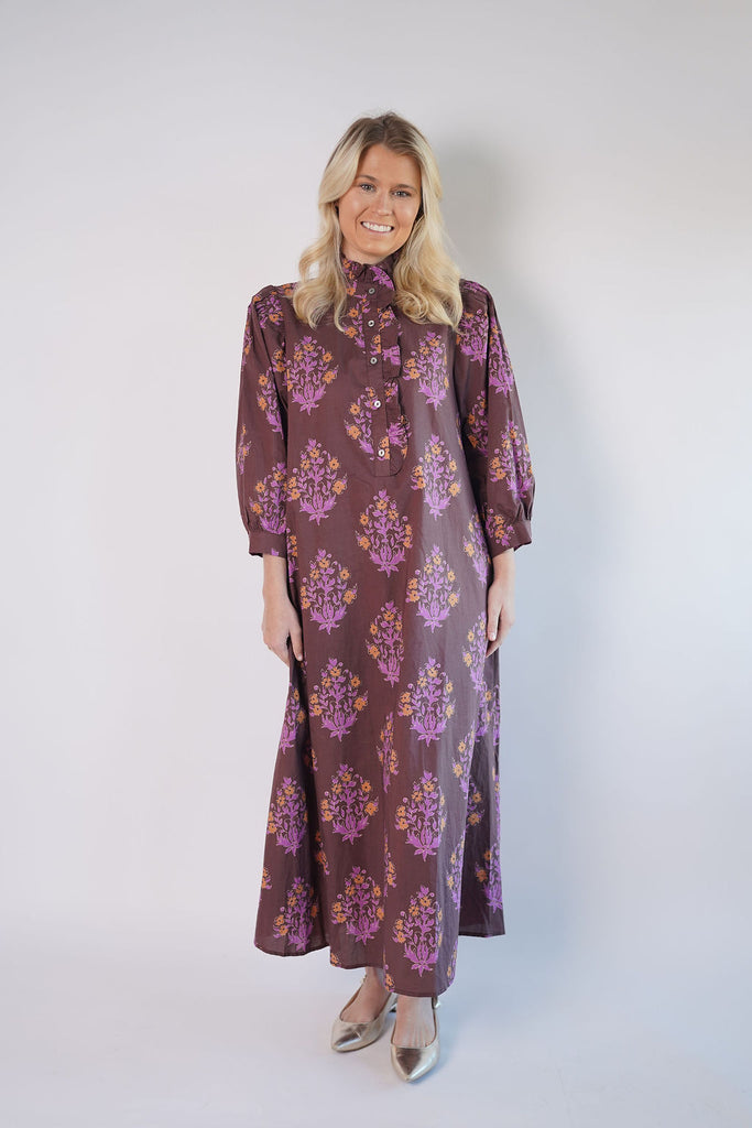Scottie Maxi Dress - Effortlessly elegant, the Scottie Maxi Dress is a rich chocolate floral dress designed for both style and comfort. Featuring a ruffle-trimmed neckline, button-front closure, and a vibrant floral print in shades of purple and cream, this dress is as versatile as it is beautiful. Its flowy design can be worn loose for an airy, relaxed look or belted for a more defined shape. Complete with pockets and a luxuriously soft fabric, the Scottie Maxi Dress is perfect for the season - ideal for workdays, casual outings, or an evening out. Pair it with your favorite gold heels, chunky boots, or your preferred shoe of choice.