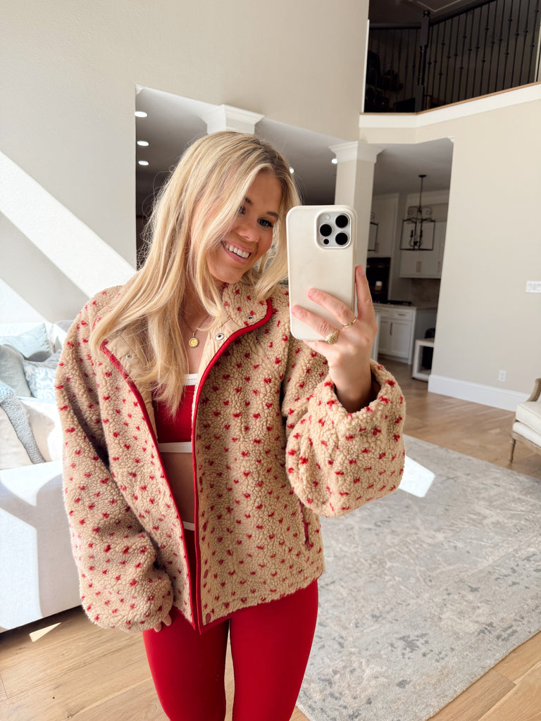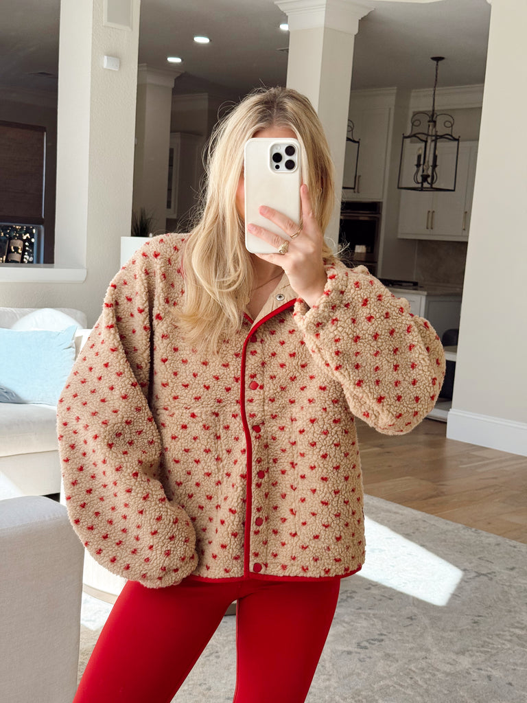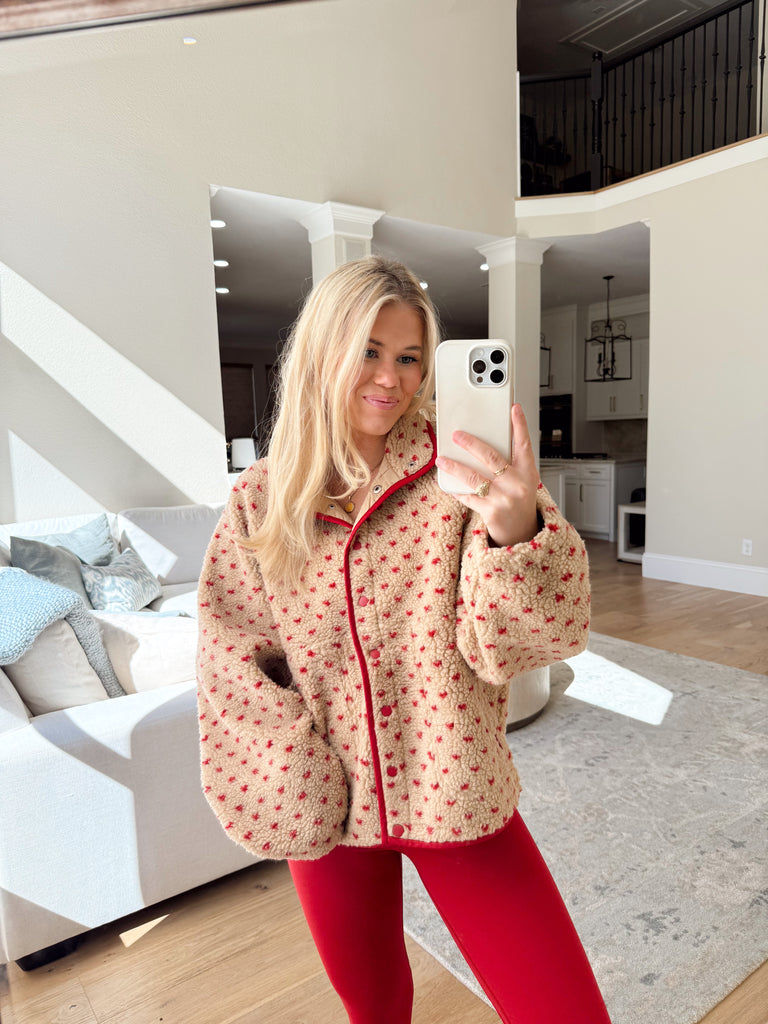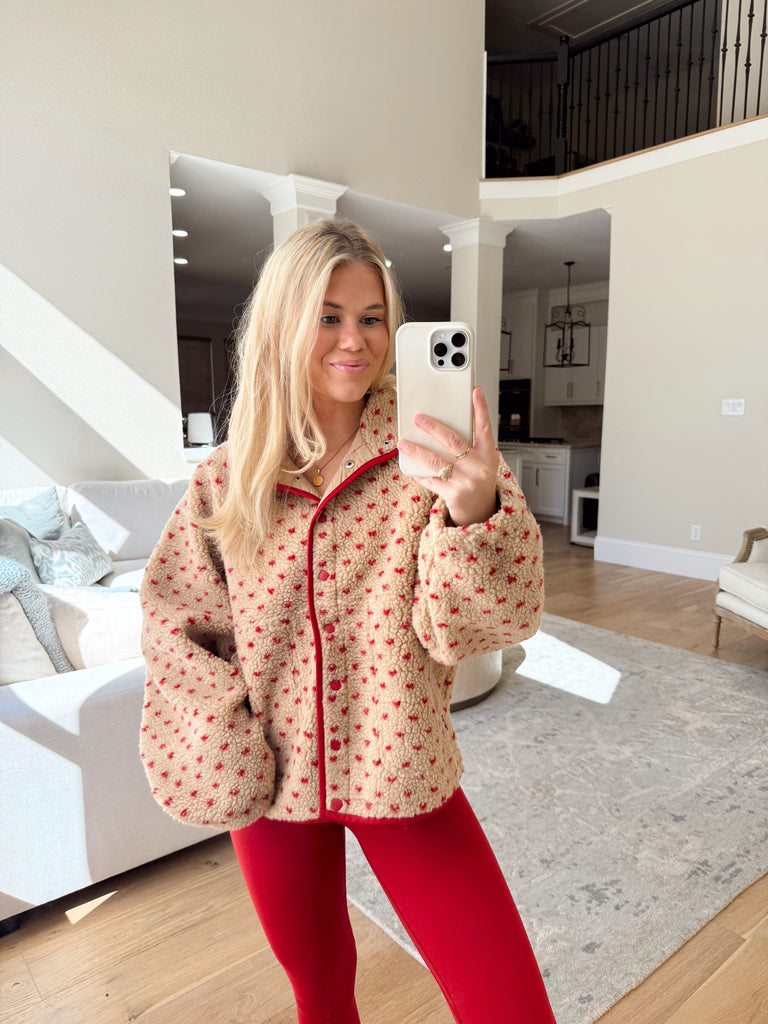 Beige Sherpa Jacket - Cozy meets cute in our fan favorite Beige Sherpa Jacket. This soft beige sherpa features adorable red polka dots and finished with a snap-front closure for effortless style. Functional zipper pockets add the perfect touch of practicality while keeping your hands warm and your essentials close. Pair it with our Joyful Is She Dylan Set for a cozy look that’s effortlessly chic and perfect for any outing.