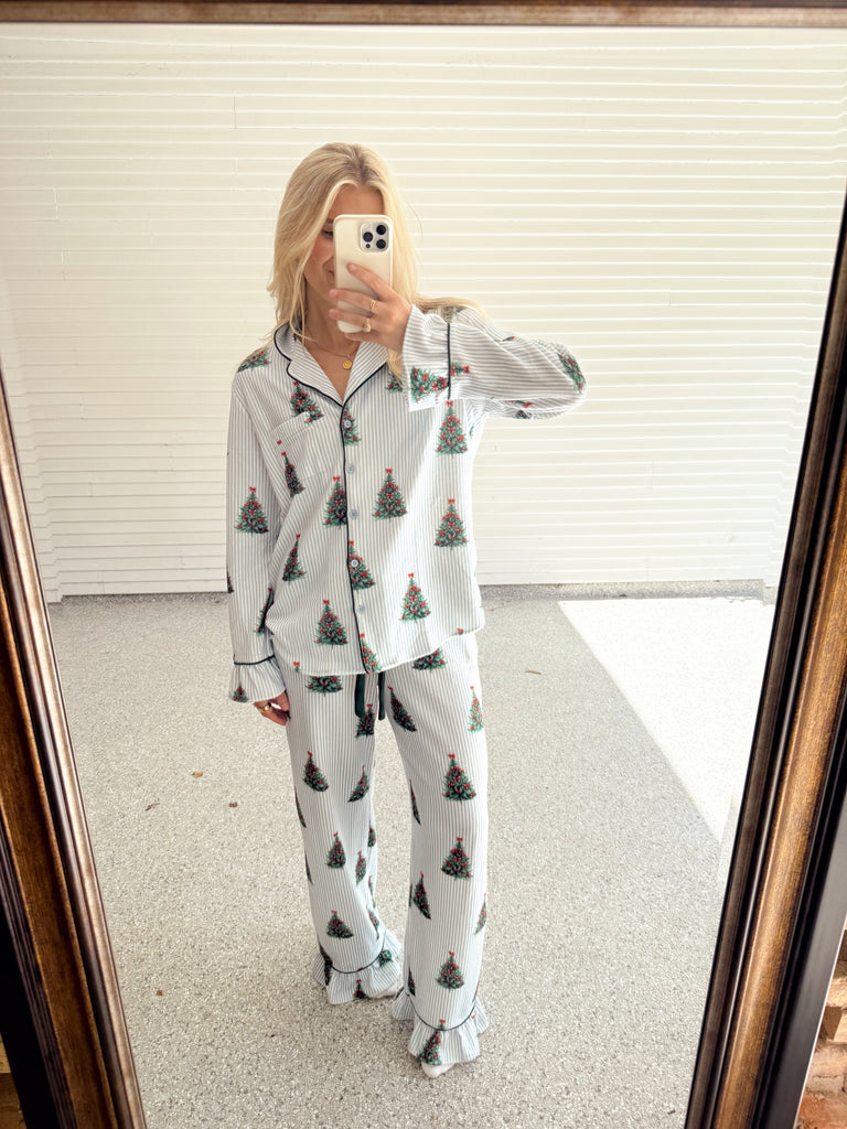 Wynter Pajama Set - The Wynter Pajama Set is a cozy holiday favorite featuring a festive Christmas tree design and soft, breathable fabric. With light blue pinstripes, flared pants, and midline button detailing, this set brings comfort and style to your winter nights!
