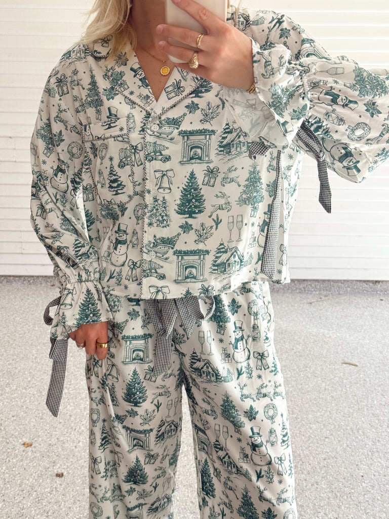 Joy Pajama Set - The Joy Pajama Set is a fan favorite, featuring a soft silky finish in festive green and cream tones. With a classic holiday-inspired design, houndstooth trim, and delicate bow detailing, this set combines comfort and style for the perfect seasonal look!