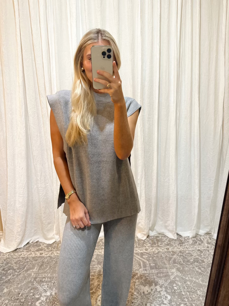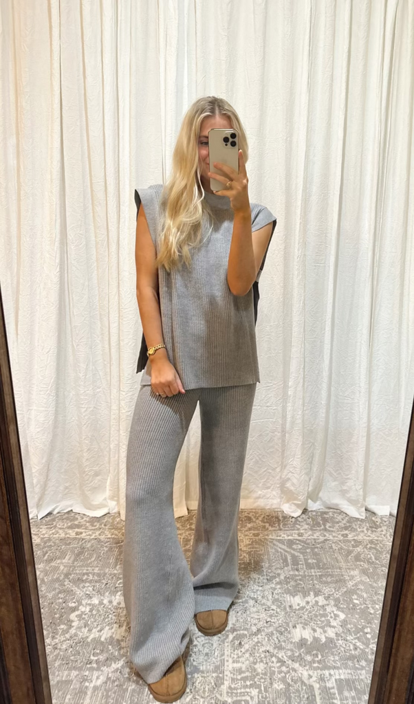 Kayleigh Set - We absolutely love the Kayleigh Set! This gray knit set is so comfortable, soft, and cute! It has adorable side detailing, which makes the opening on the sides. This would be so great paired with a long sleeve underneath when it is cold outside. It is perfect for loungewear or going out! Make comfy cute with this set!