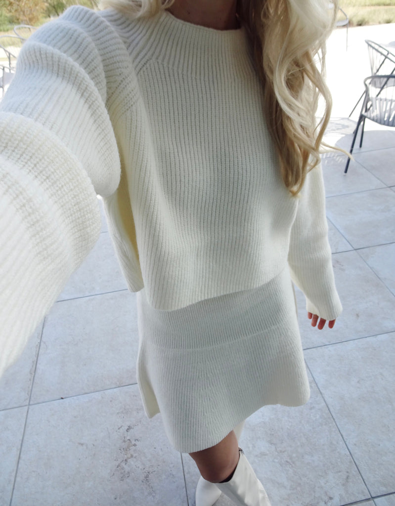 Kendall Cream Knit Set - This cream sweater and skirt knit set is absolutely adorable and perfect for the season! The skirt has the cutest shape with a fit and flare cut. This outfit would be adorable paired with boots or sneakers for many occasions. Get your Kendall Set today!