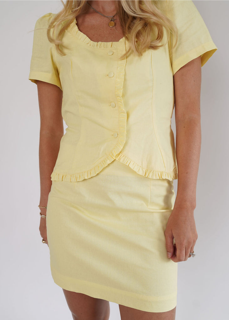 Lanie Set - Bright, cheerful, and made to stand out! This sunny yellow set features playful, petite ruffle accents, border trim, and delicate button detailing for a unique feminine finish. Fully lined for comfort and confidence. Ideal for the office, brunch with friends, or an evening out. Pair with heels, sandals or your favorite shoes.