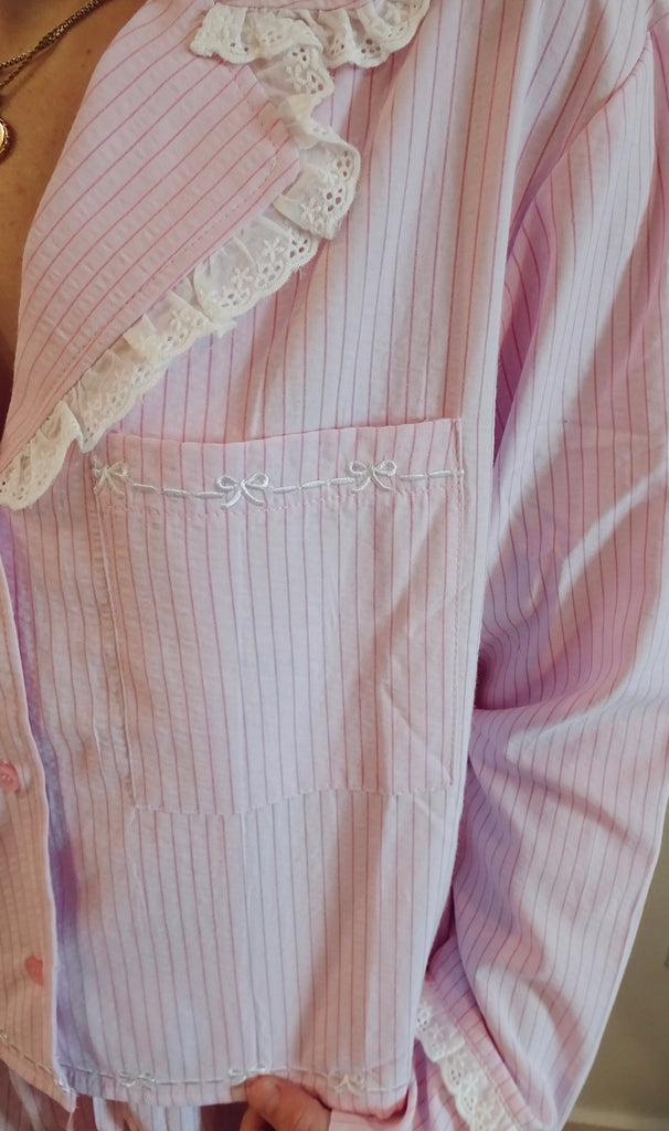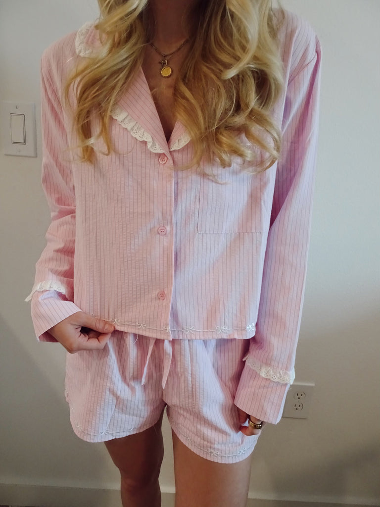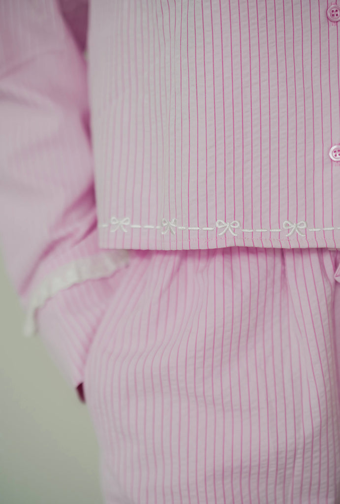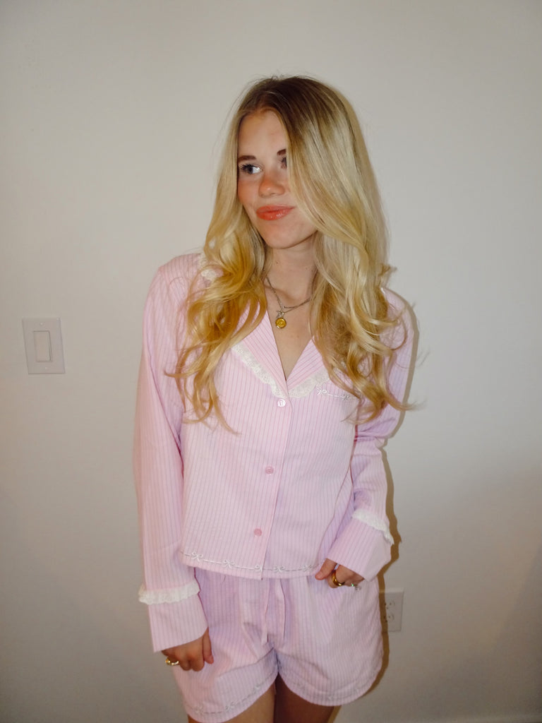 Lennon Pink Set - These pink pinstripe pajamas are so incredibly cute and comfy! We love the adorable bow detailing. These would be the perfect valentines gift for yourself or a friend!