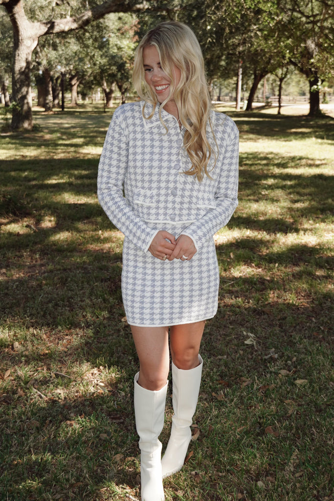 Lyla Set - This blue and cream houndstooth pattern set is absolutely adorable! It has the cutest button, collar, and pattern detailing. Not only is this stunning as a set, but these pieces can also be worn separately for different occasions! Don't miss out on this super cute set!