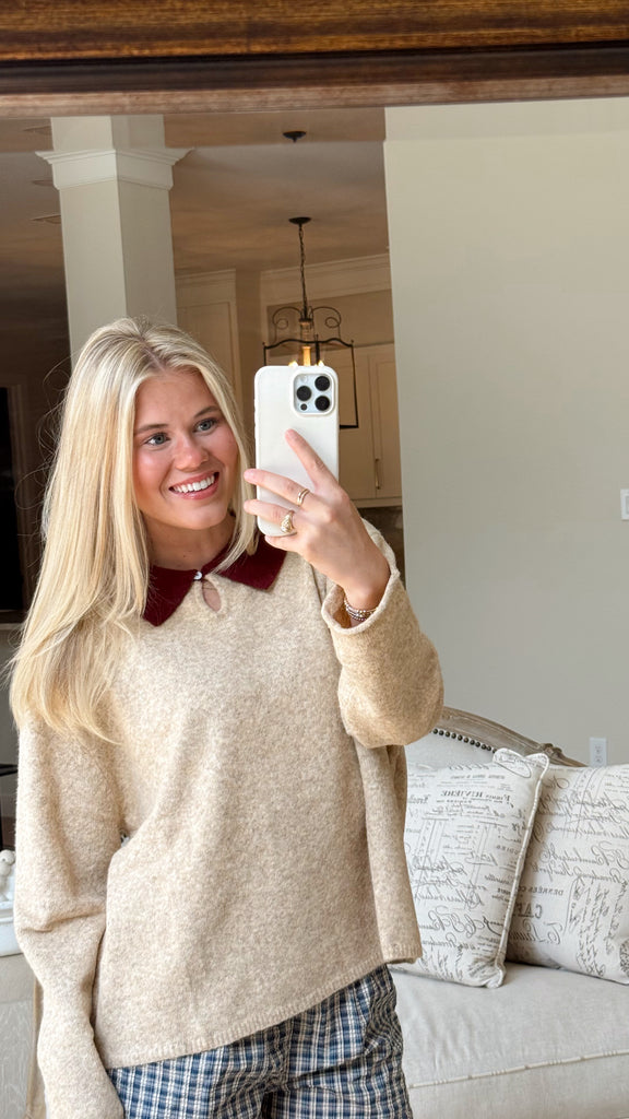 Kendall Collared Top - The Kendall Collared Top is already a fan favorite! Its soft beige fabric with burgundy collared detailing creates a stylish, versatile look that’s perfect for any occasion. Style the Kendall Collared Top with jeans, shorts, or your favorite bottoms to elevate your outfit.