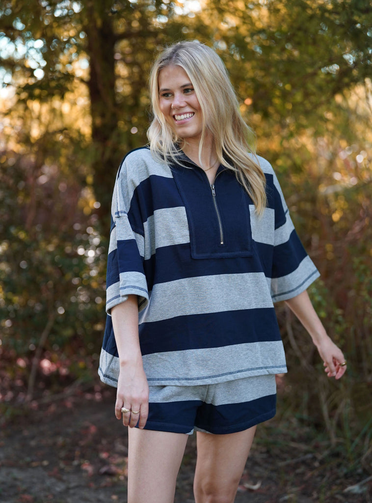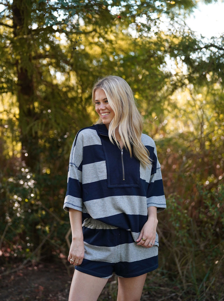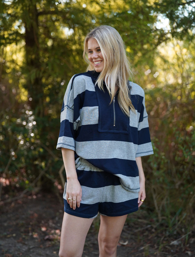 Naomi Stripe Set - Step into effortless style and comfort with the Naomi Stripe Set. Crafted from soft material, this set features bold navy and gray stripes for a modern, fun look. The flowy top with a half-zip front ensures a relaxed fit, while the matching shorts complete a versatile set you can wear together — or mix and match with your favorite denim bottoms or playful tops. The Naomi Striped Set is perfect for lounging, casual outings, or styling your own cozy-adorable ensembles.