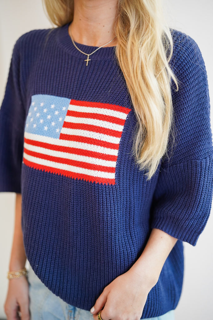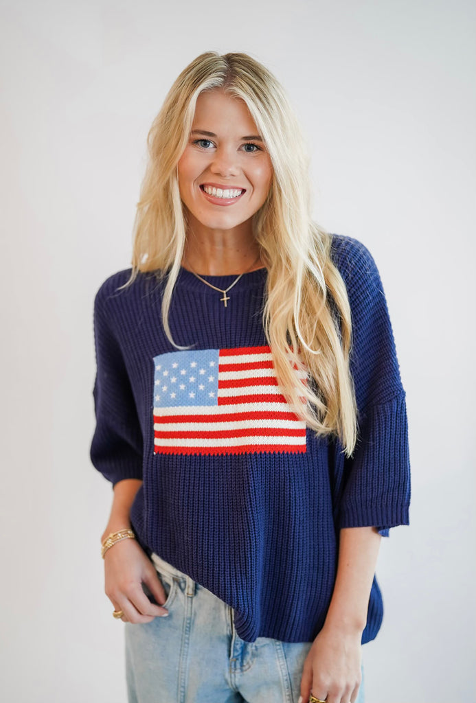 All American Sweater - This sweater top is one of our absolute favorites! Its quarter sleeves and knit material sets this top apart from others. This top is perfect with jeans or shorts. Get your All American Sweater today!