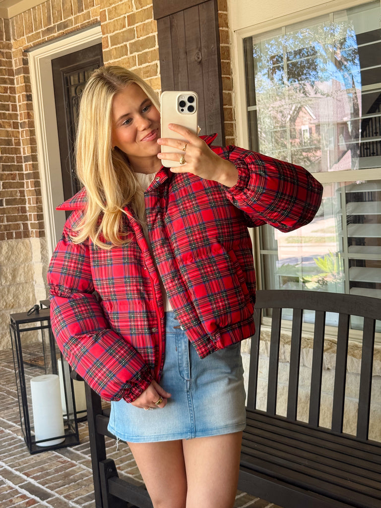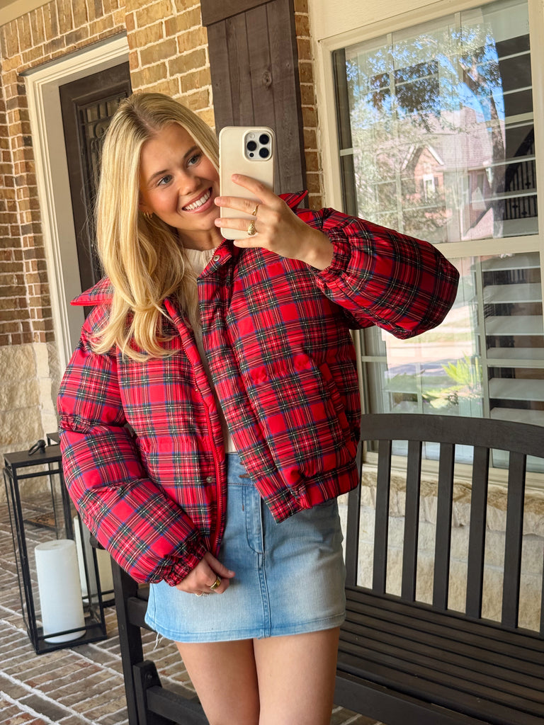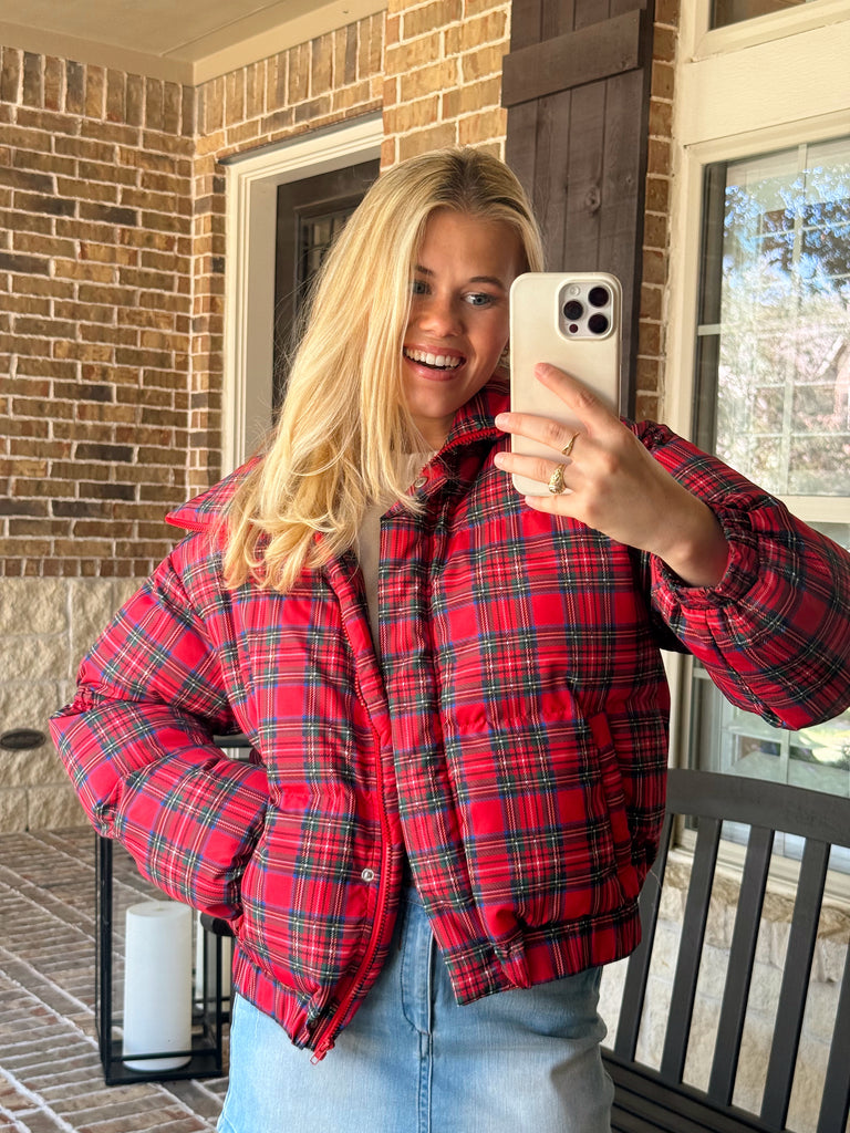 Gracyn Plaid Puffer Jacket - A fan favorite for a reason! The Grayson Plaid Puffer Jacket combines cozy comfort with standout style. Its bold mix of red, cream, black, green, and yellow plaid makes it a true statement piece for the season. Designed with midline buttoning over a hidden zipper and a fully lined interior, this jacket keeps you warm while looking effortlessly stylish!
