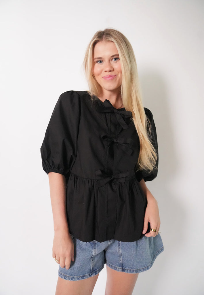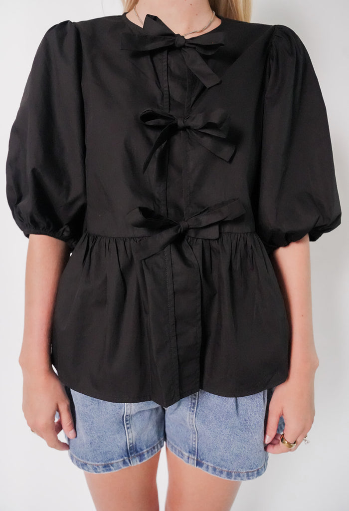 Henley Top - This classic black Henley Top features delicate tie-front bows and a flared hem for a flattering fit. The Henley is your go-to for spontaneous plans. Style with denim, a skirt, or your favorite staples.