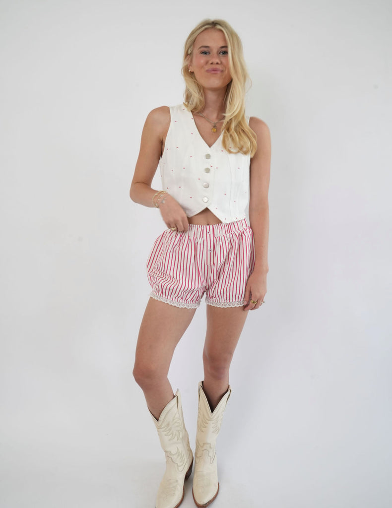 Holly Bow Top - Adorable and eye-catching, this white denim top features midline button detailing and bold red petite bows that bring all the flair!