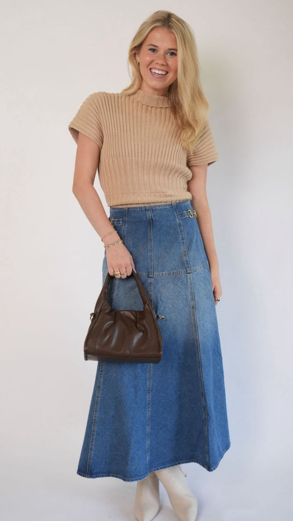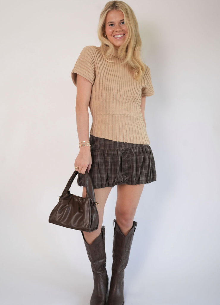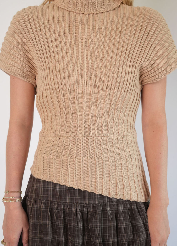 Jayda Top - Elevate your wardrobe with the Jayda Top. This tan sweater stands out with its asymmetrical detailing, adding a unique twist to a cozy, versatile design. Perfectly paired with jeans, skirts, pants, or shorts, the Jayda Top combines comfort and style for an effortlessly stylish look all season long.